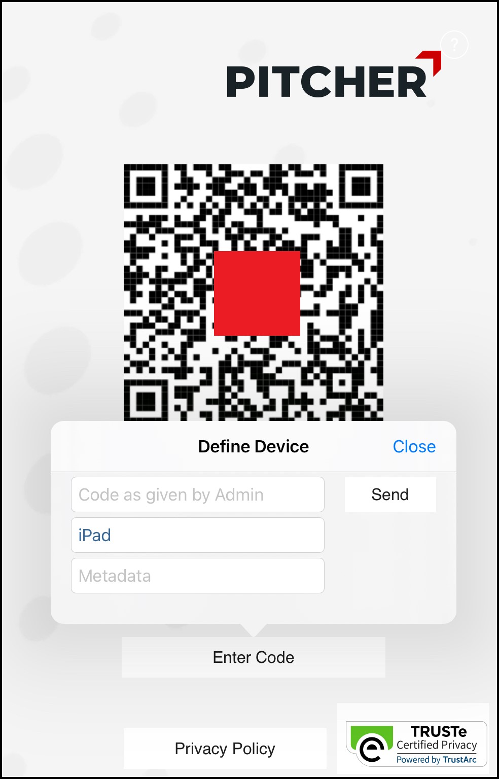 Access the Pitcher Impact app on your device, tap Enter Code, and specify the code given by the administrator. Note that you must specify the device name along with the code. Pitcher recommends that you specify a device name that is easily identifiable.