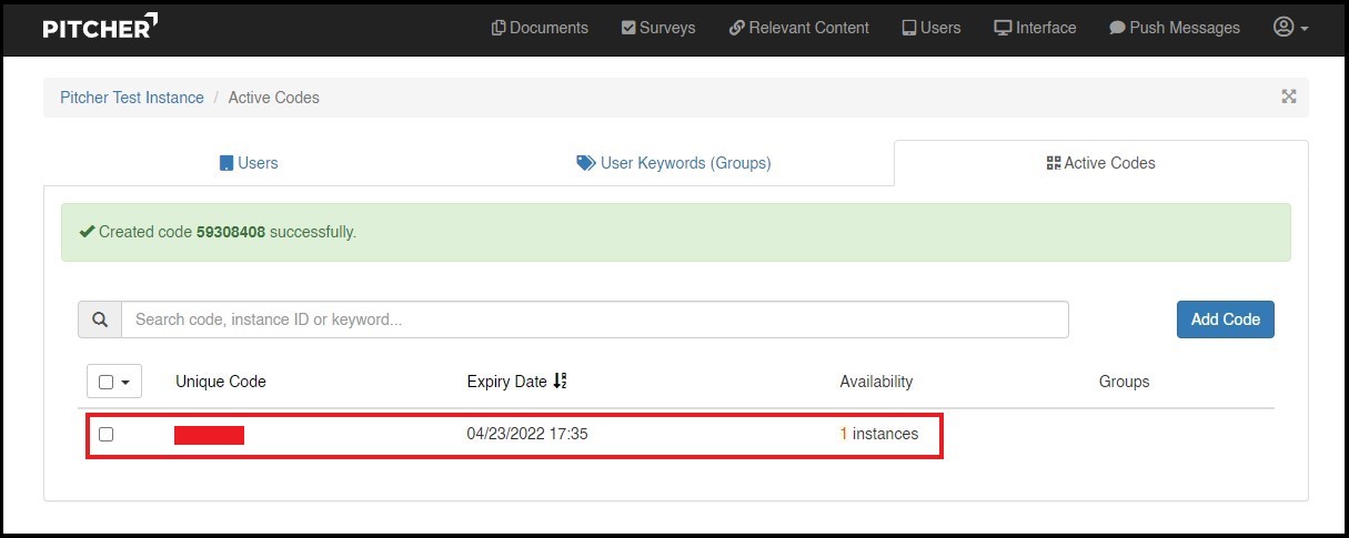 After you save the code, you are directed to the screen that shows all created and active codes. You can delete these codes, if required.