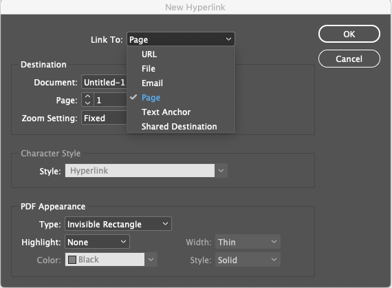 5. To create a hyperlink to another page in your file click on select "page"