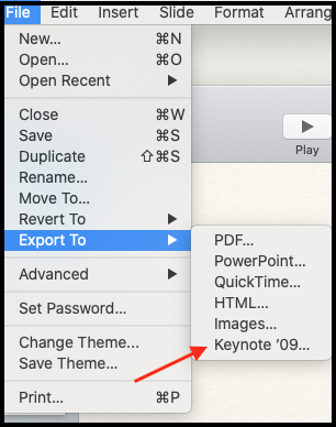 5. Export your file to "Keynote '09" before uploading it to Pitcher Admin.