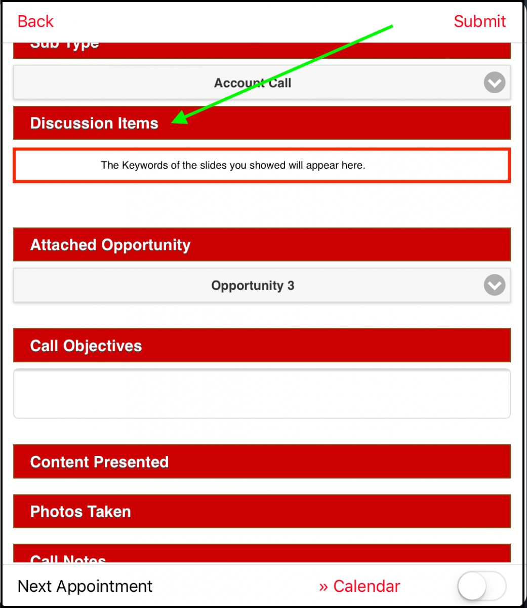 Discussion Items - After completing a meeting with an account/contact you can see the keywords from the slides you showed during the meeting. This is visible in the Post-Call Form (this is just one example of how it can look) under "Discussion Items".
