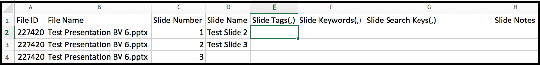 Note: When you download the Excel document Column G "Slide Search Keys" will show all the text from within the slide.