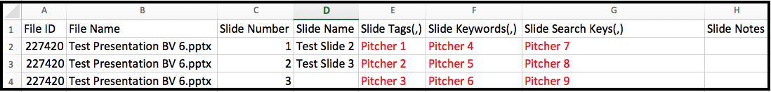 The results show the exact slide where the keyword was given. In the results below you can see that "Slide 3" has the keyword "Pitcher 3" given in Column E or Column G.
