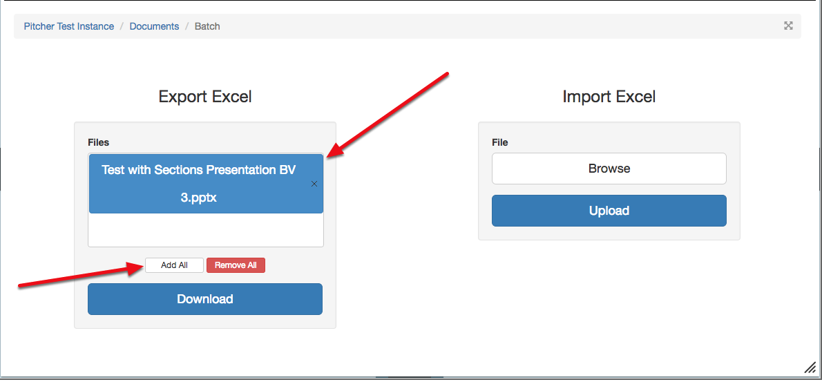 3. Once you have clicked on "Batch", the window below will appear. Under the Heading "Export Excel" you can see the document you selected previously.