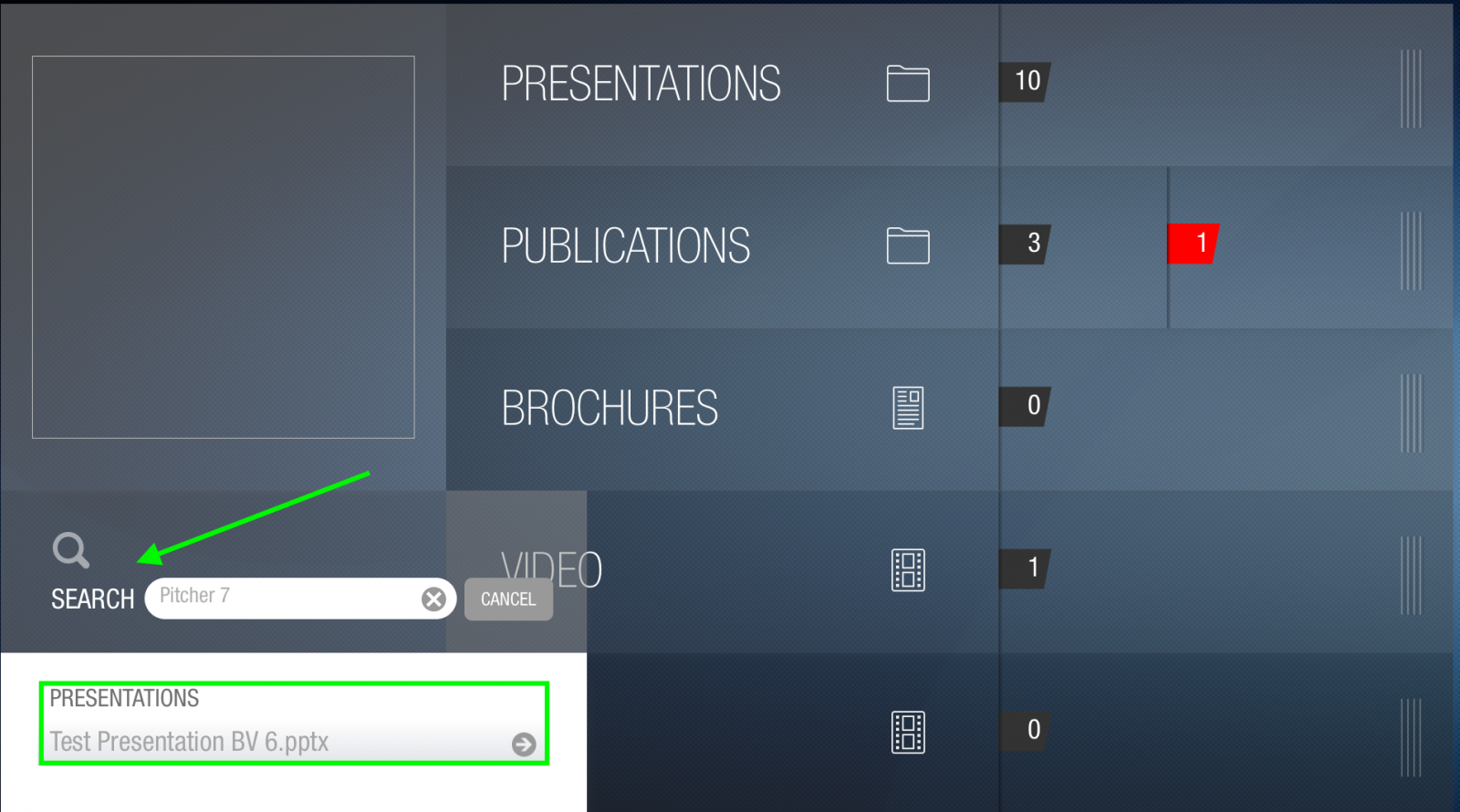 Search from UI - Tap on "Search" and enter the keyword ("Pitcher 7") specified in the Excel document above for the slides in Column E or Column G. The presentation that contains the slide you searched for will appear in the search results. Tap on it to open (it does not take you to the specific slide).