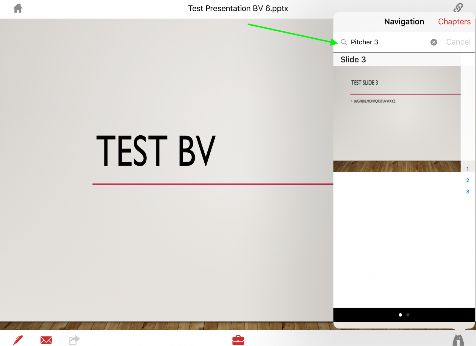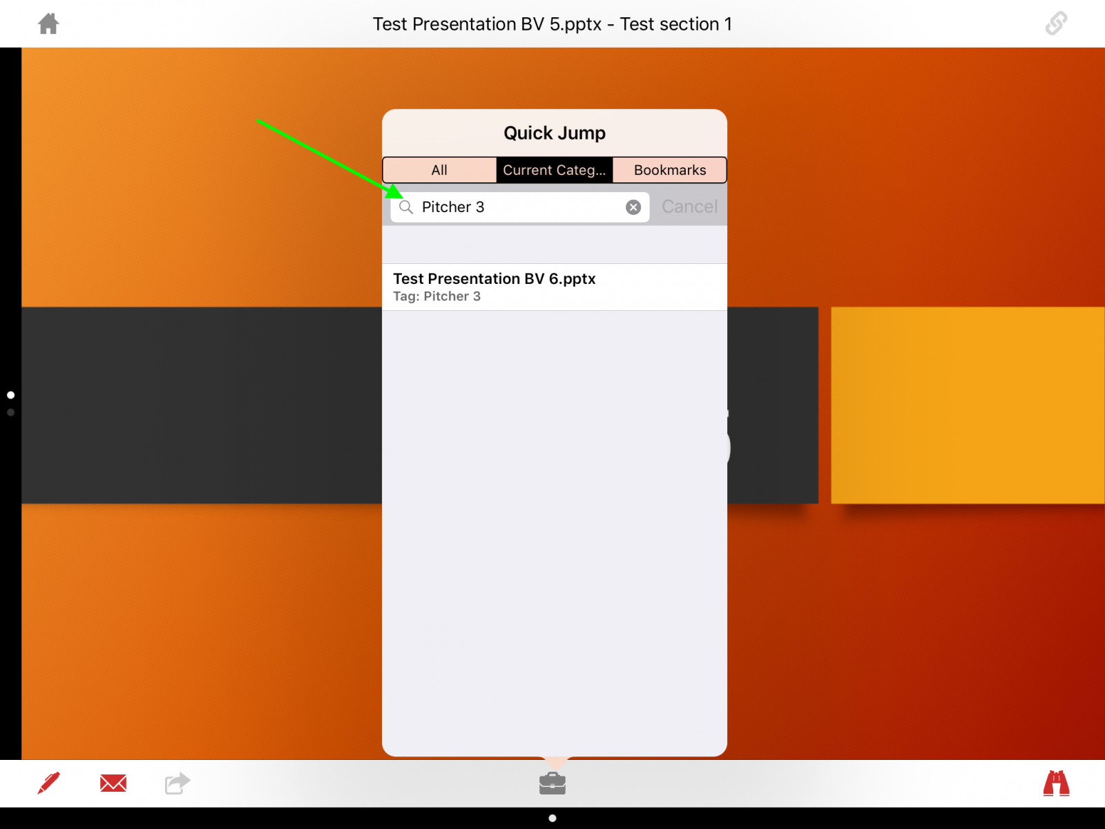 Search from Binoculars - To look for keywords from within a presentation (slides) tap the binoculars button and then enter your keyword ("Pitcher 3") into the search bar.