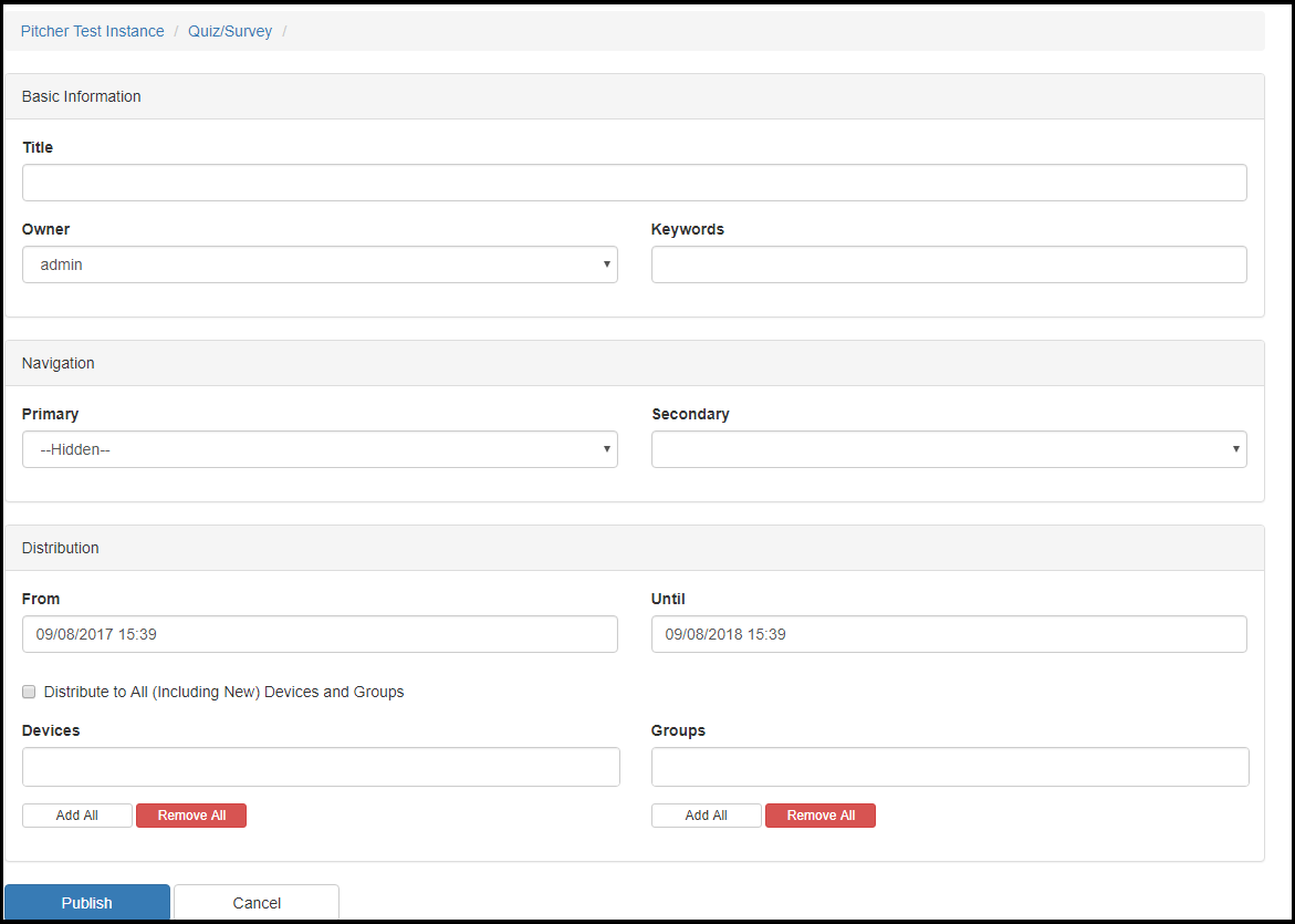 After creating questions you can click "Save & Publish" to save the Survey. In this screen you will enter the title, owner and keywords of the survey.