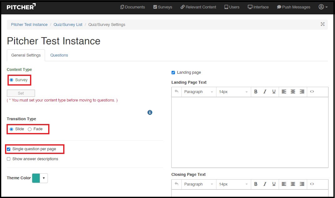 2. Before adding the Questions in a Survey you must define "Content Type" as "Survey" and set. You can also set your transition type and "Single Question Per Page" property.