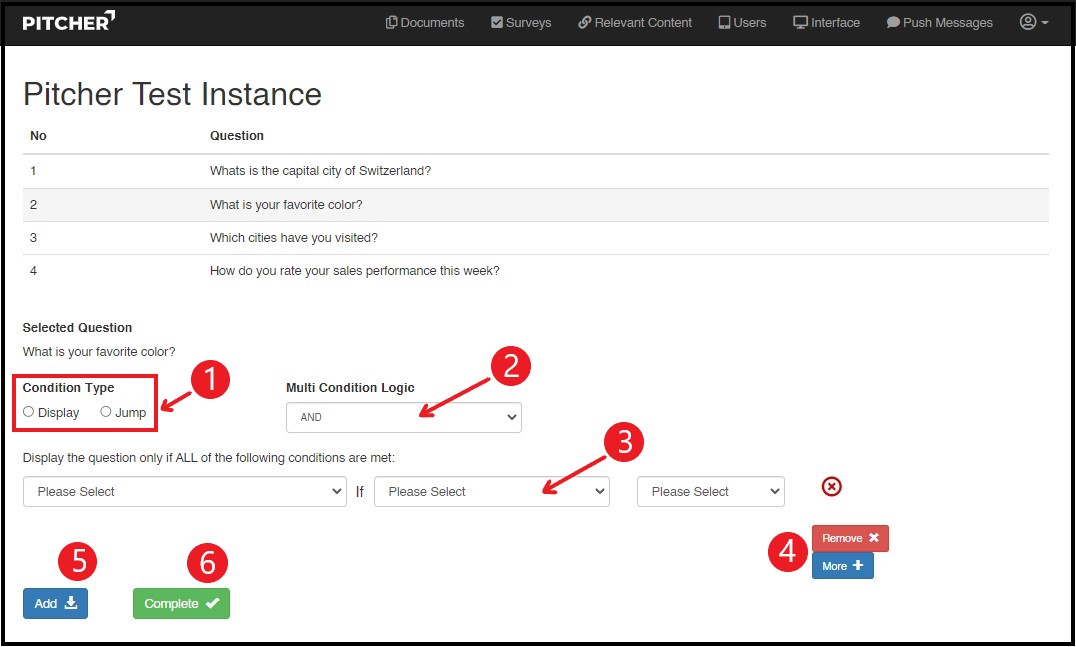 This page provides knowledge about creating conditional surveys in Pitcher Admin. Survey questions can be made dependent based on the previous answers. This enables the Surveys to have a hierarchical structure based on the feedback provided by the person responding, whether it is a Customer or the Rep itself.