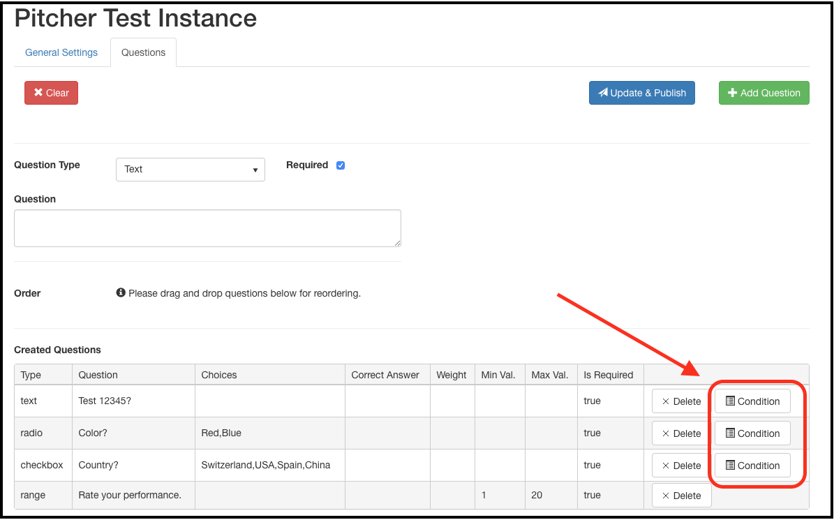 You can set conditions in a survey question. In order to set conditions for a Survey question click on the “Condition” button on the Questions as displayed below:
