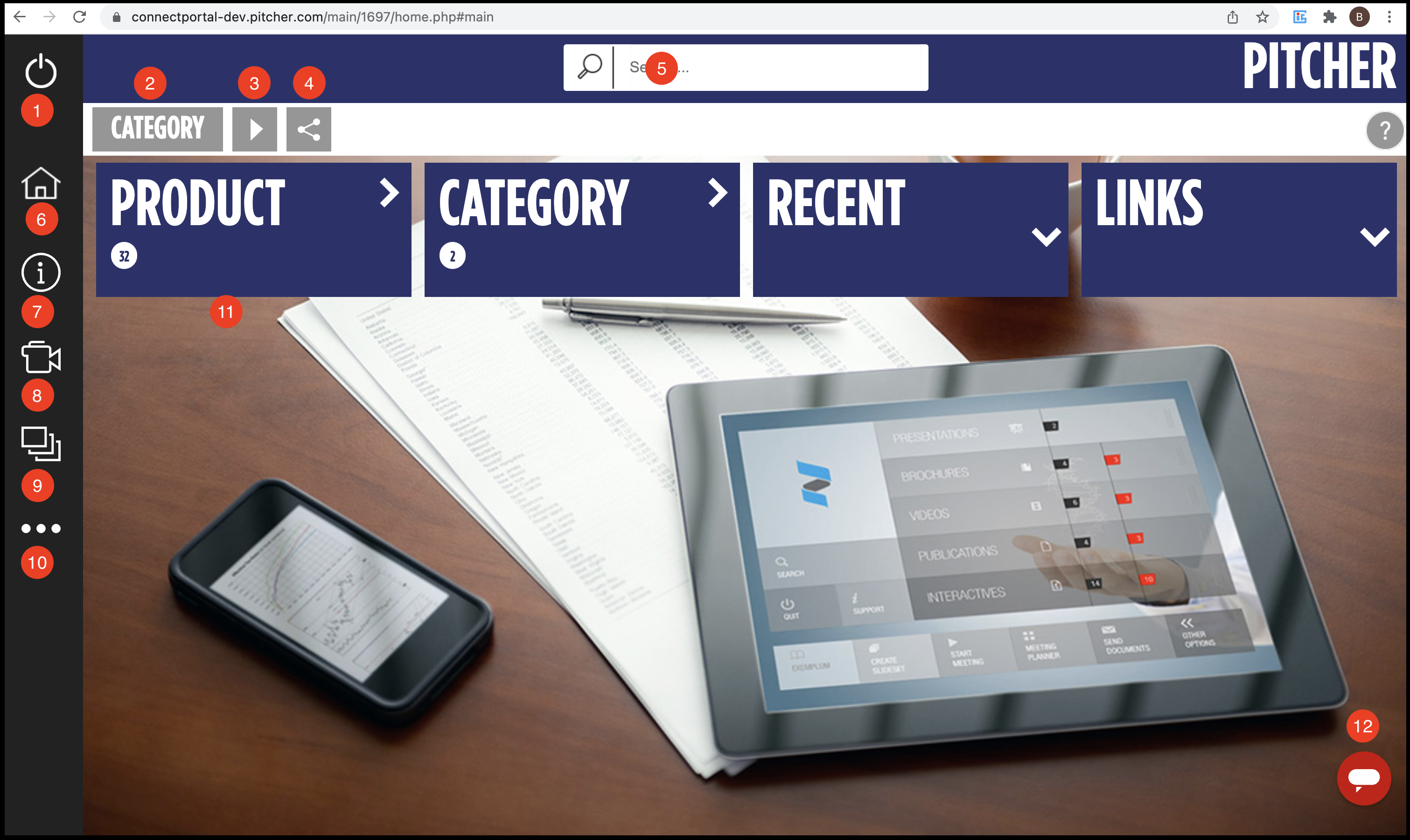 Pitcher Connect has the same user interface as that of the Pitcher Impact application, in addition to Pitcher Impact’s features, Pitcher Connect has a left menu bar with specific functionalities.