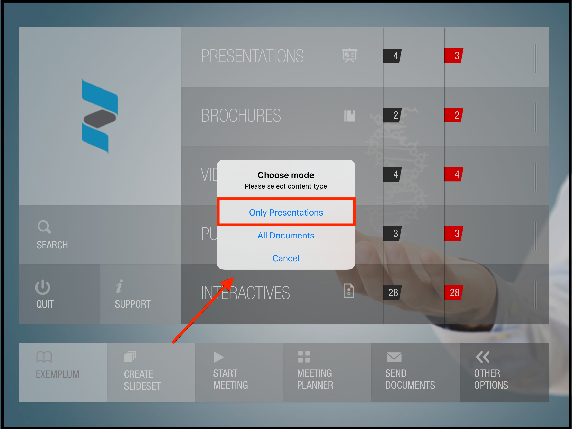 On the Home Screen or under Presentations, Create Slide Set button is present. If tapped it will ask for the user’s permission. Select the Only Presentations option from the popup window.