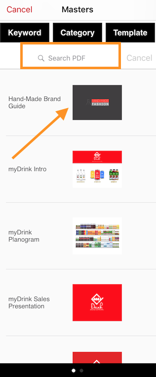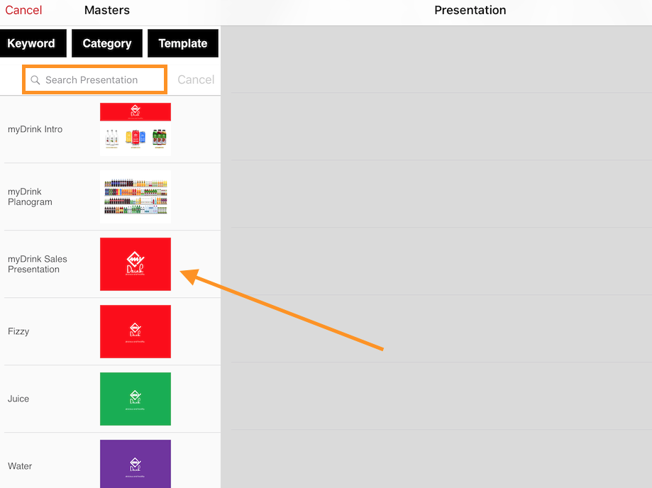 If Only Presentations is tapped then only presentation documents will be seen where user can choose from the available presentations to create a custom slide-set. Specific presentation can be searched in the search bar at the top of the list.