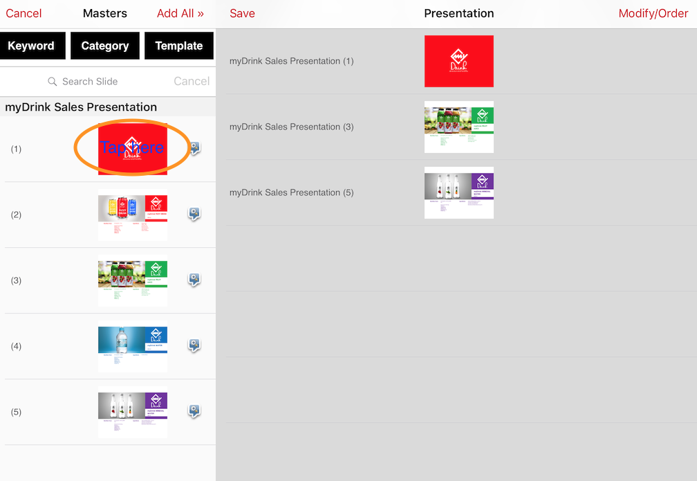 To choose a slide simply tap on it and it will move into the list on the right.