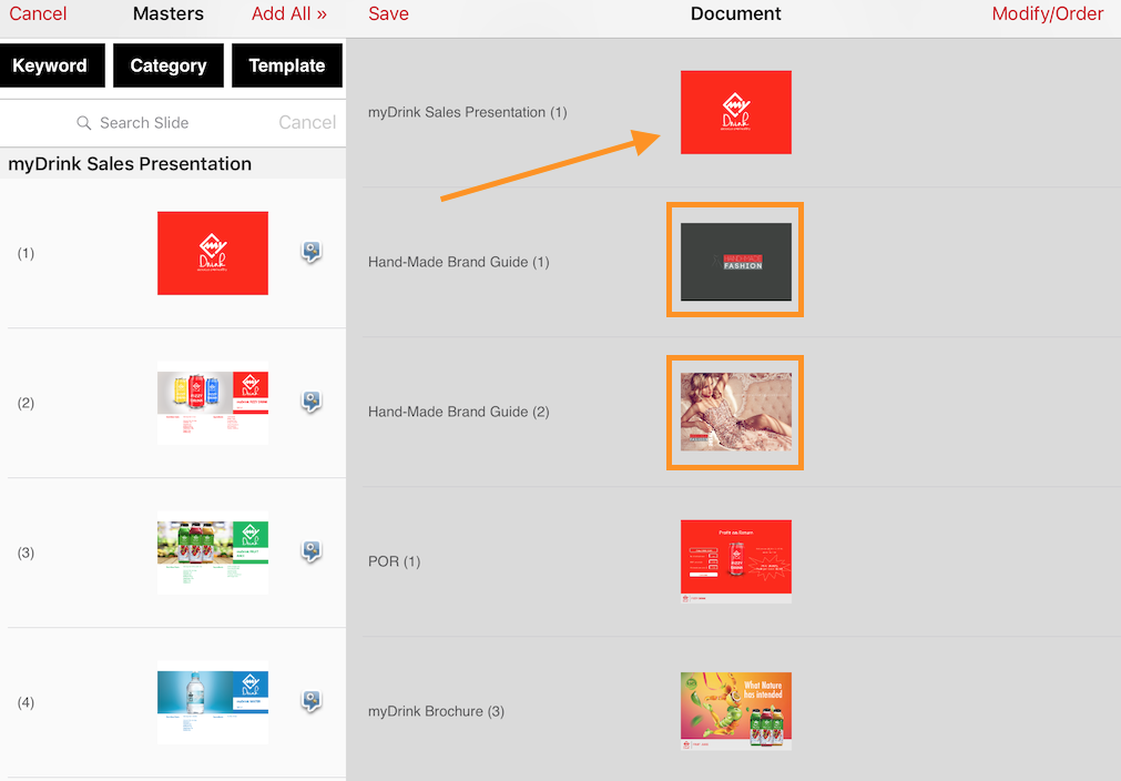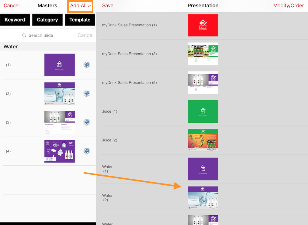 If you tap "Add All" then all slides from the presentation you are on will be added.