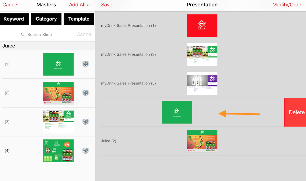 At anytime during editing you can remove a slide from your custom slideset. Just swipe from right to left as indicated by the arrow below, then tap "Delete" and the slide will be removed.