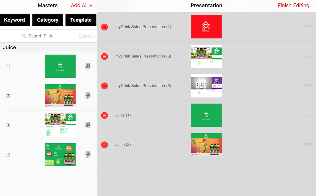 You have the possibilty to modify the order of you slides in your custom slideset. Tap "Finish Editing" when you have determined the order you would like.