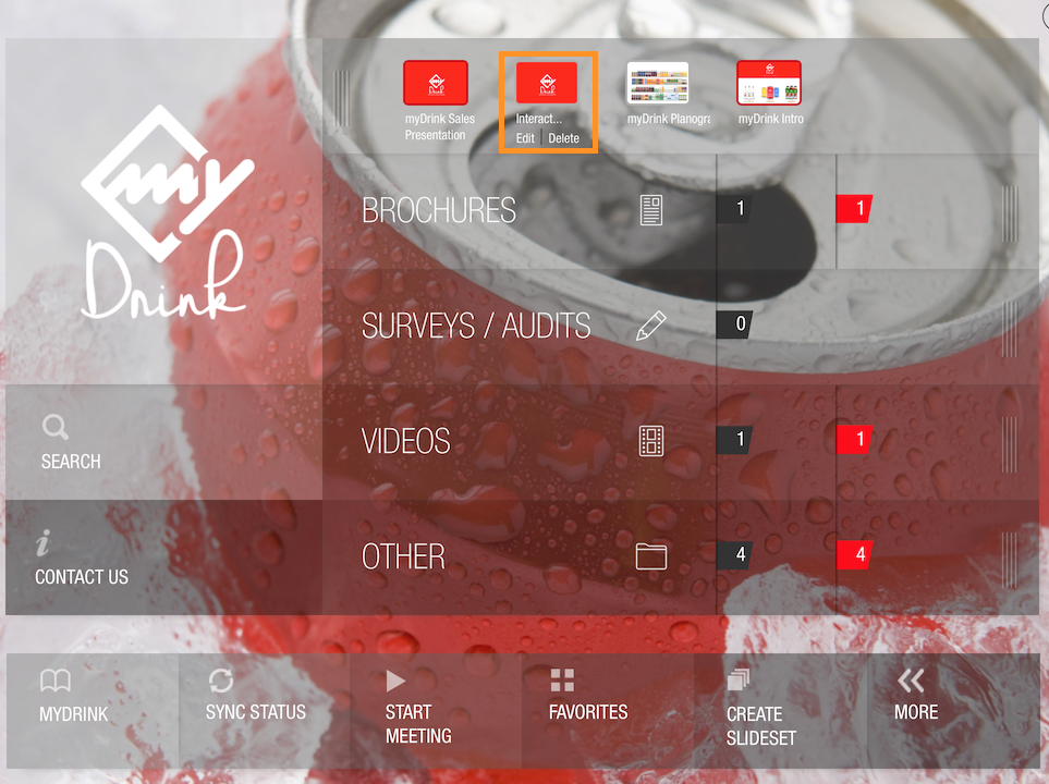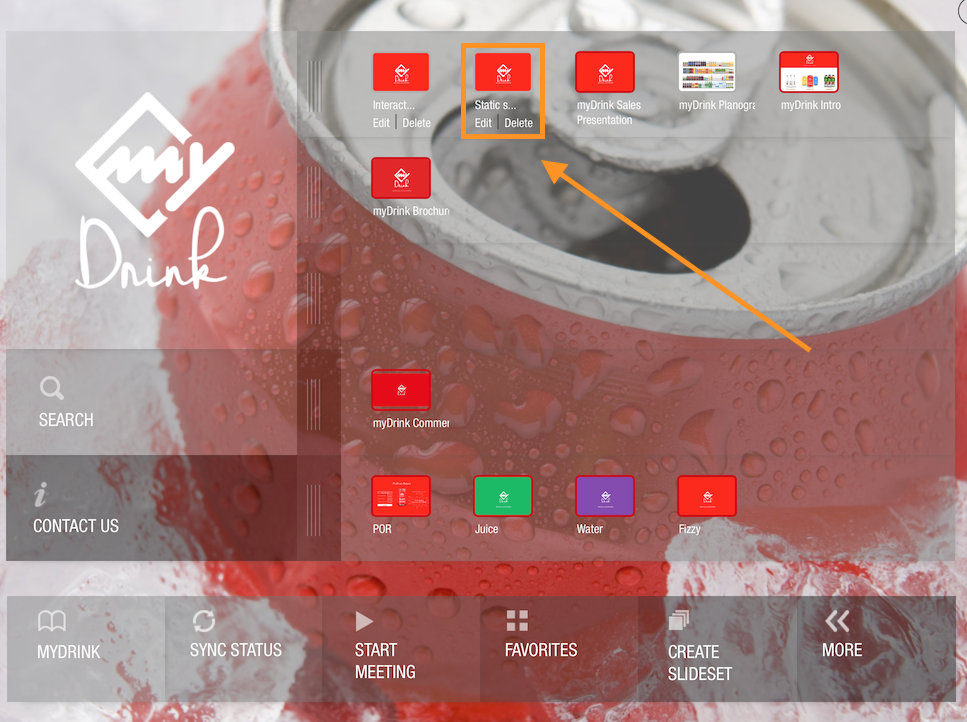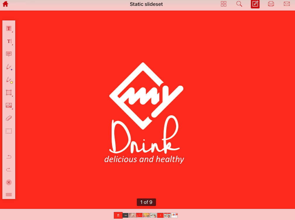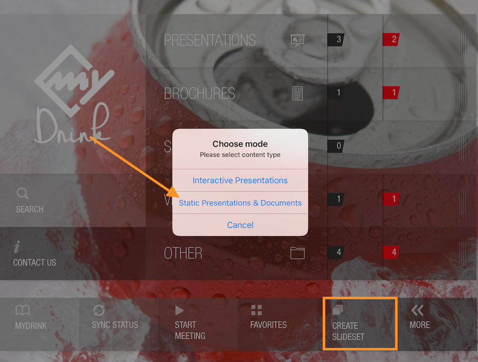 The custom slideset contains PDF pages ("Hand-Made Brand Guide") and Presentation slides (myDrink Sales Presentation) as shown below.