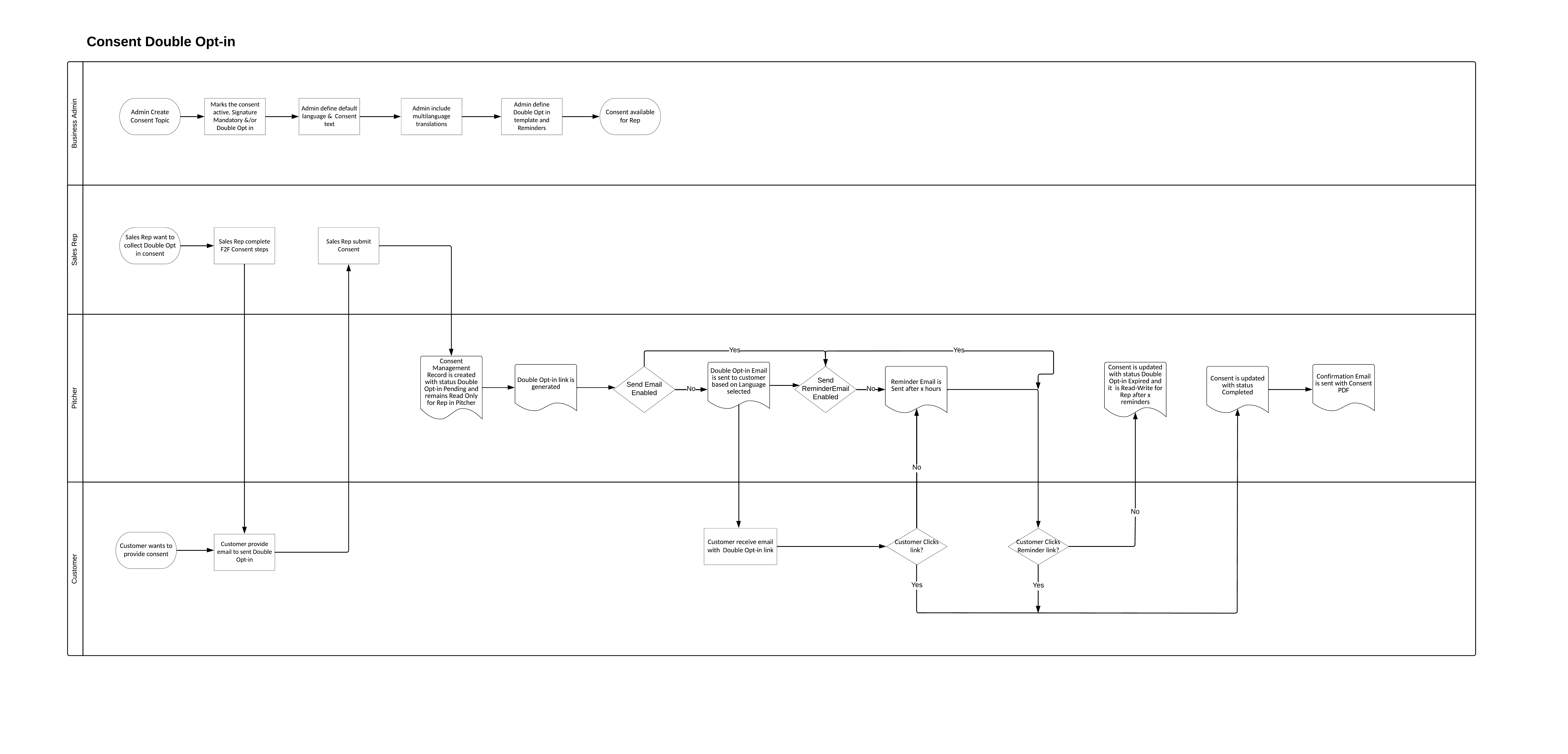 Any consent can be defined as requiring a double Opt-in consent based on market regulation. This process allows the customer to confirm that Consent captured in a F2F meeting has been captured correctly by the Sales Rep.