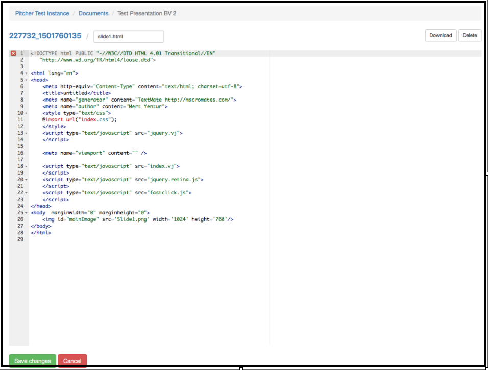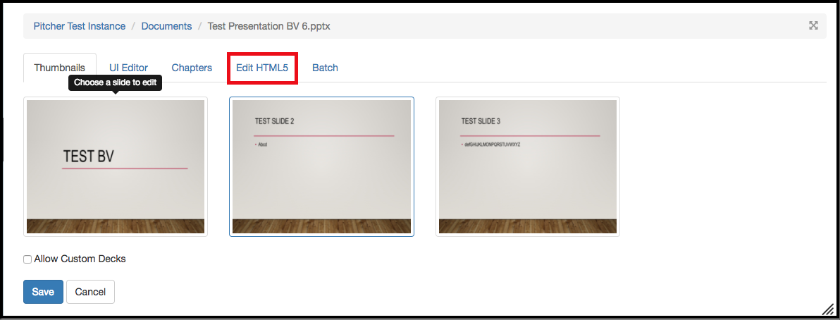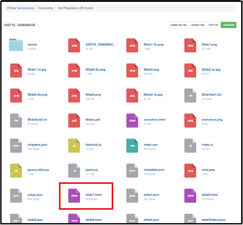 This page gives a walkthrough on editing HTML5 files in Pitcher Admin. Presentations (and other files types) that are uploaded to Pitcher Admin are converted to HTML 5. When editing presentations you have the option of editing the HTML5 of individual slides of a presentation.