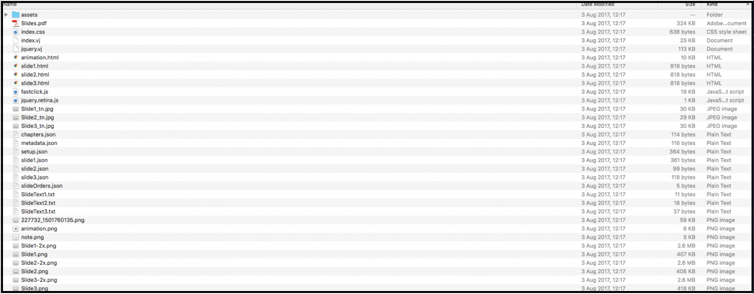 2. When you click "Download" the folder with all the presentation files will be downloaded to you computer. This can look similar to the image below with all the different file types. Simply open the HTML files to edit/ HTML content to the individual slides.