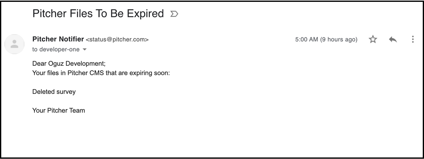 Once the content is getting to its expiration date, Pitcher Web Admin will automatically trigger 4 notifications events in the shape of emails, as follow:
