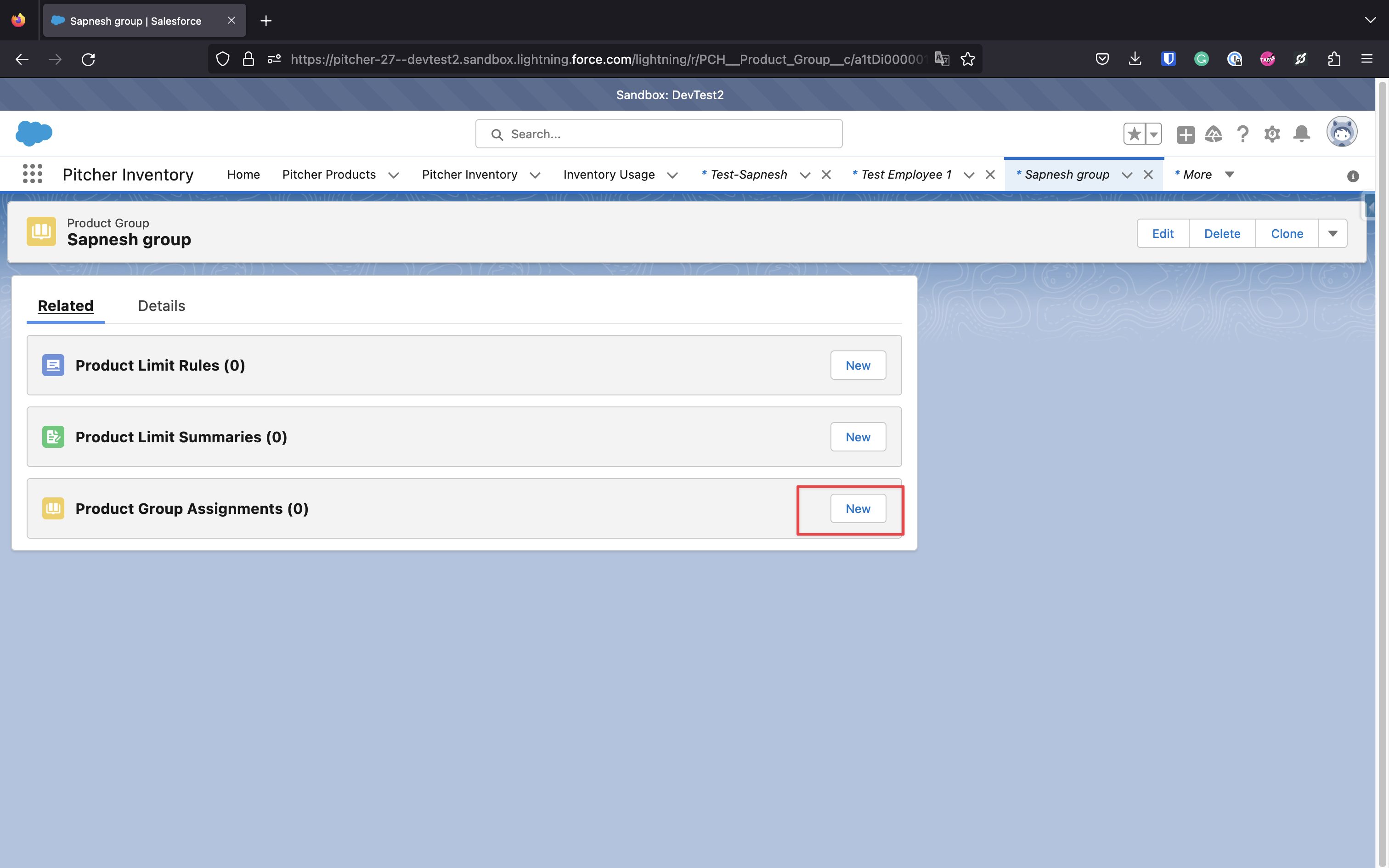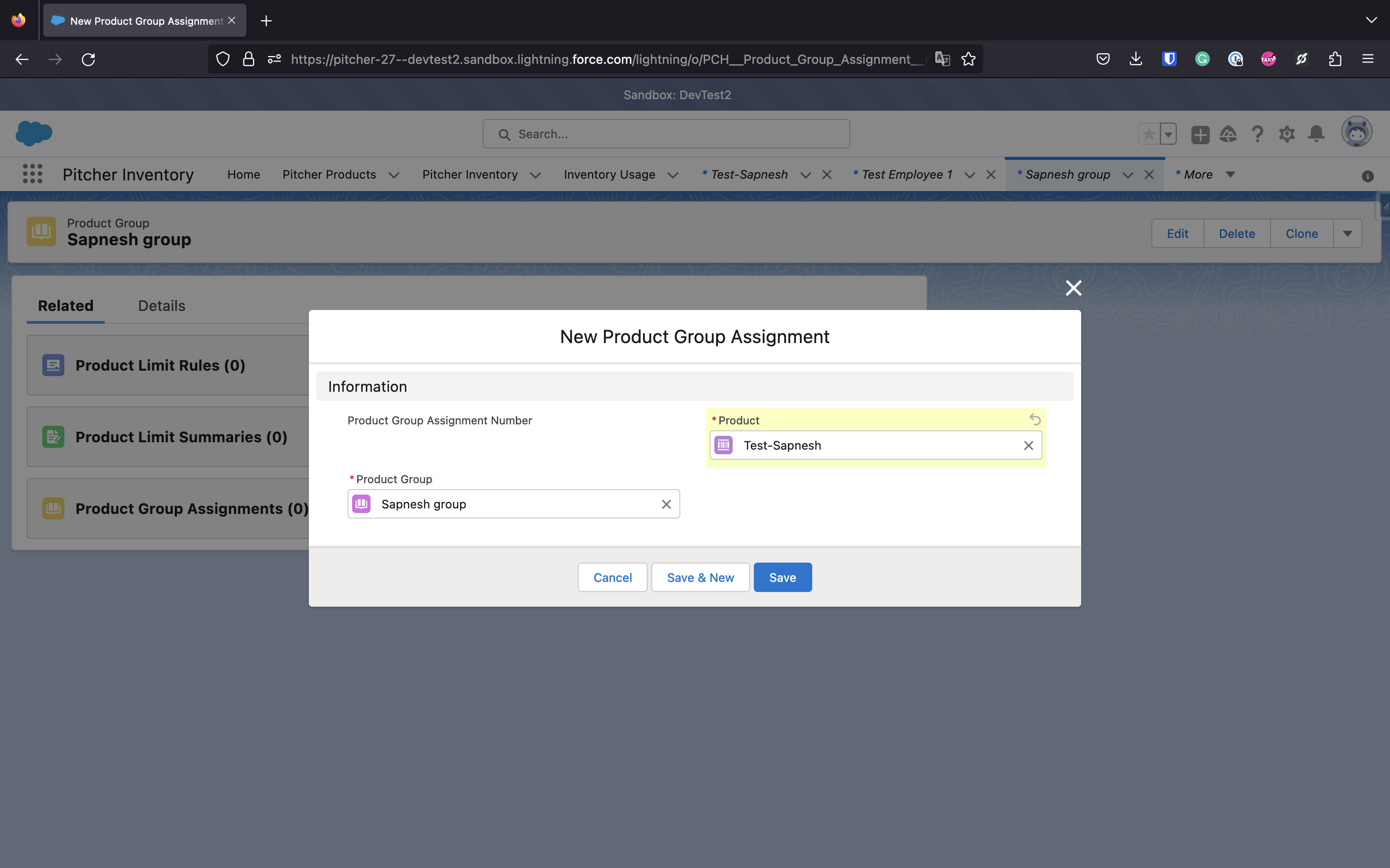 To assign Products (Samples/Materials) to your new group. Go to the Related tab for the Product Group and create a new Product Group Assignment. Select the required Product in the New Product Group Assignment form and Save changes.