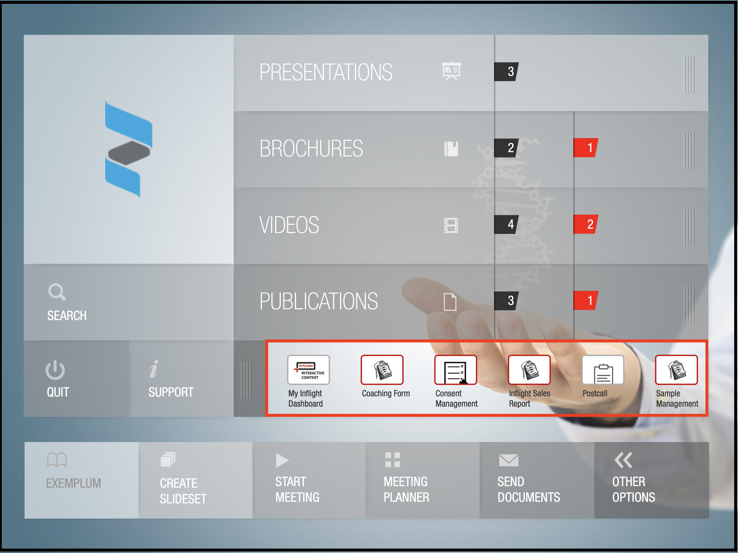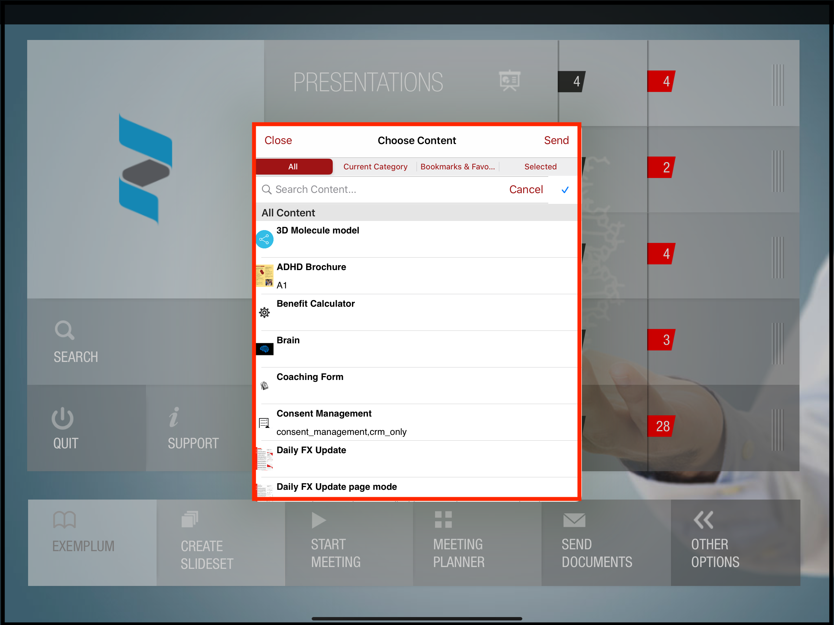 Send documents - Allows the user to share the documents via email, pitcher drive. Users can easily send their presentations to their customers. For more details, please refer to Send Materials part.