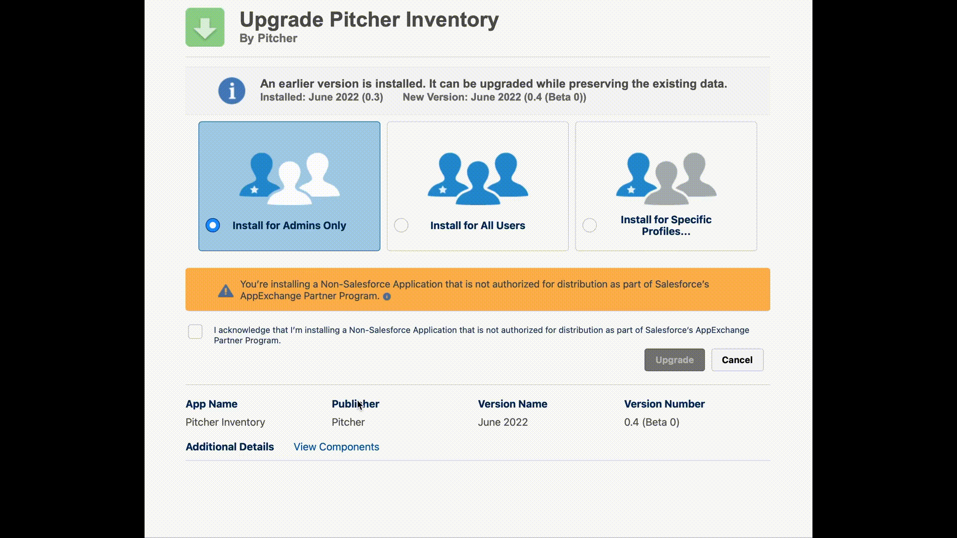 To verify the package components before installation/upgrade, click on the “View Components” link.