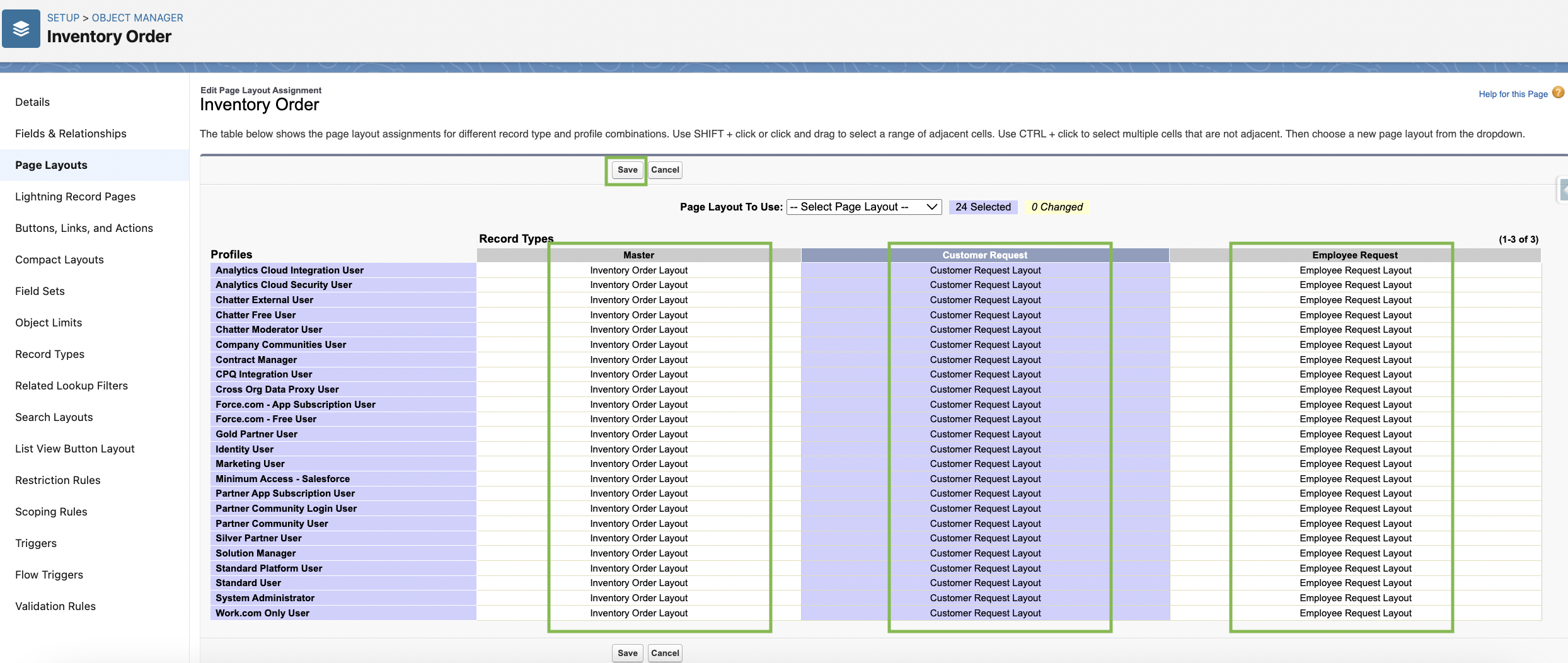 In similar way modify “Inventory Order Builder” and enter Customer_Request,Employee_Request in the record types
