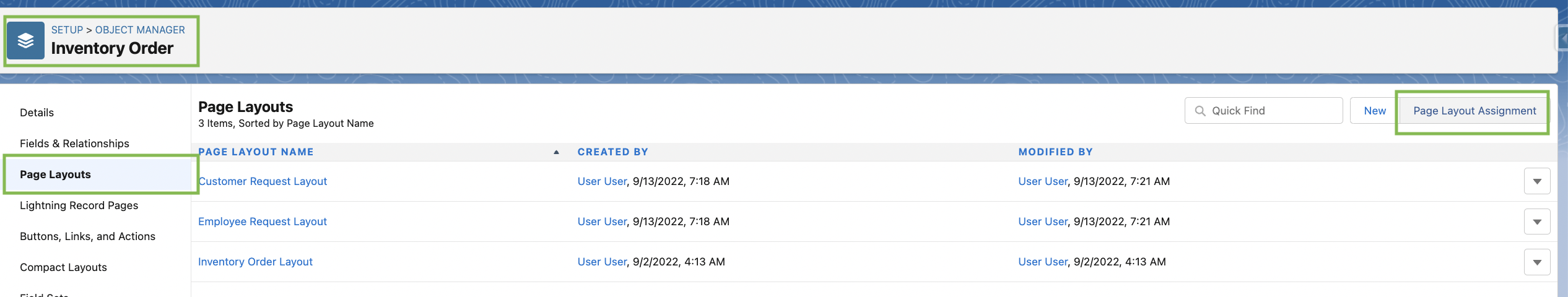 Setup → Object Manager → “Inventory Order” Object → Page Layouts