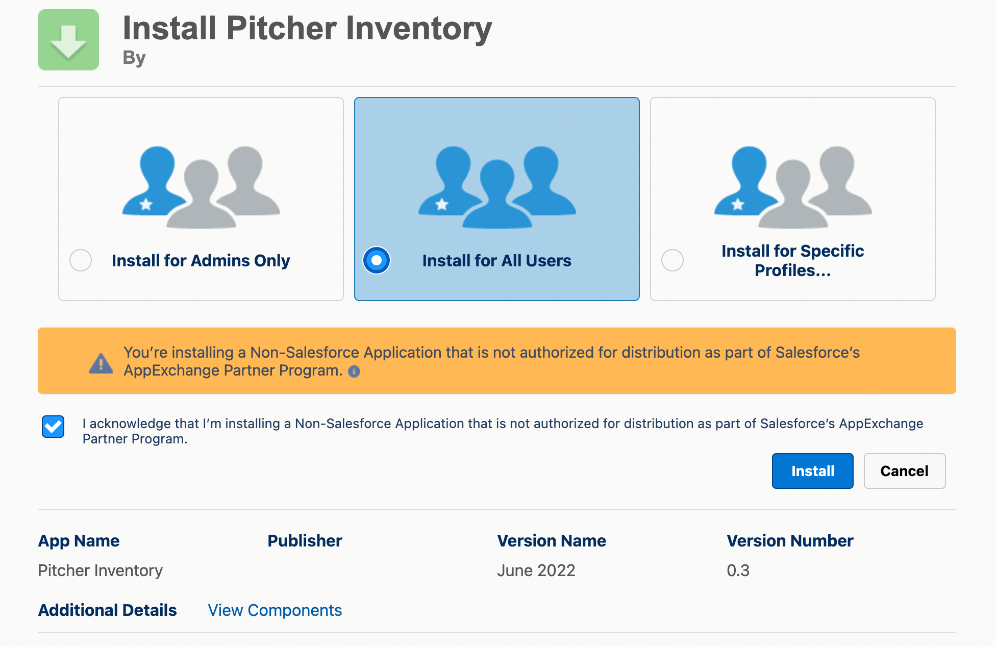 Check the acknowledgement and click Install to proceed.