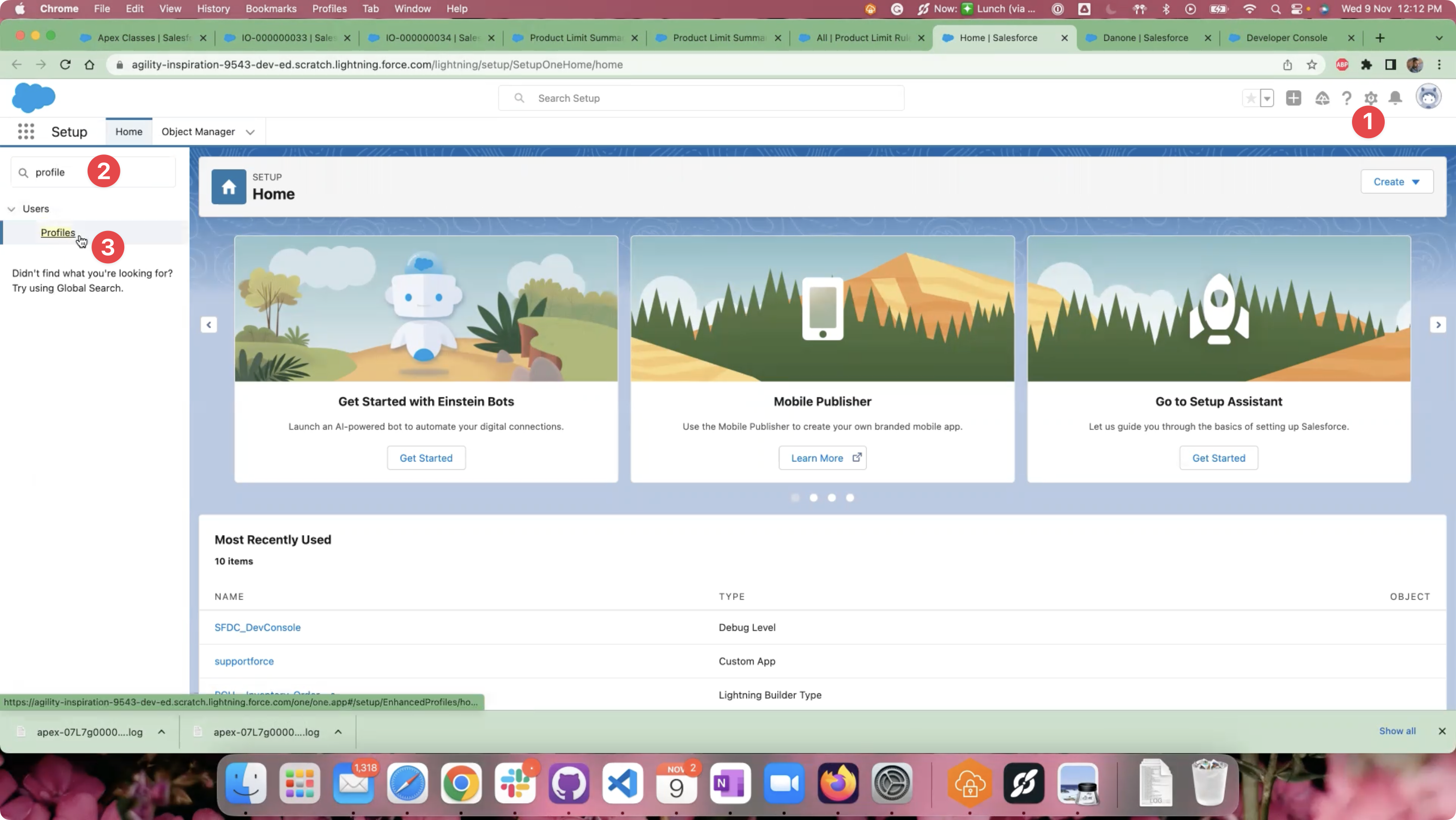Go to the Profiles page by navigating to the “Setup” > “Users” > “Profiles” page or by searching for “Profiles” in the Quick Find search box from the Setup page.