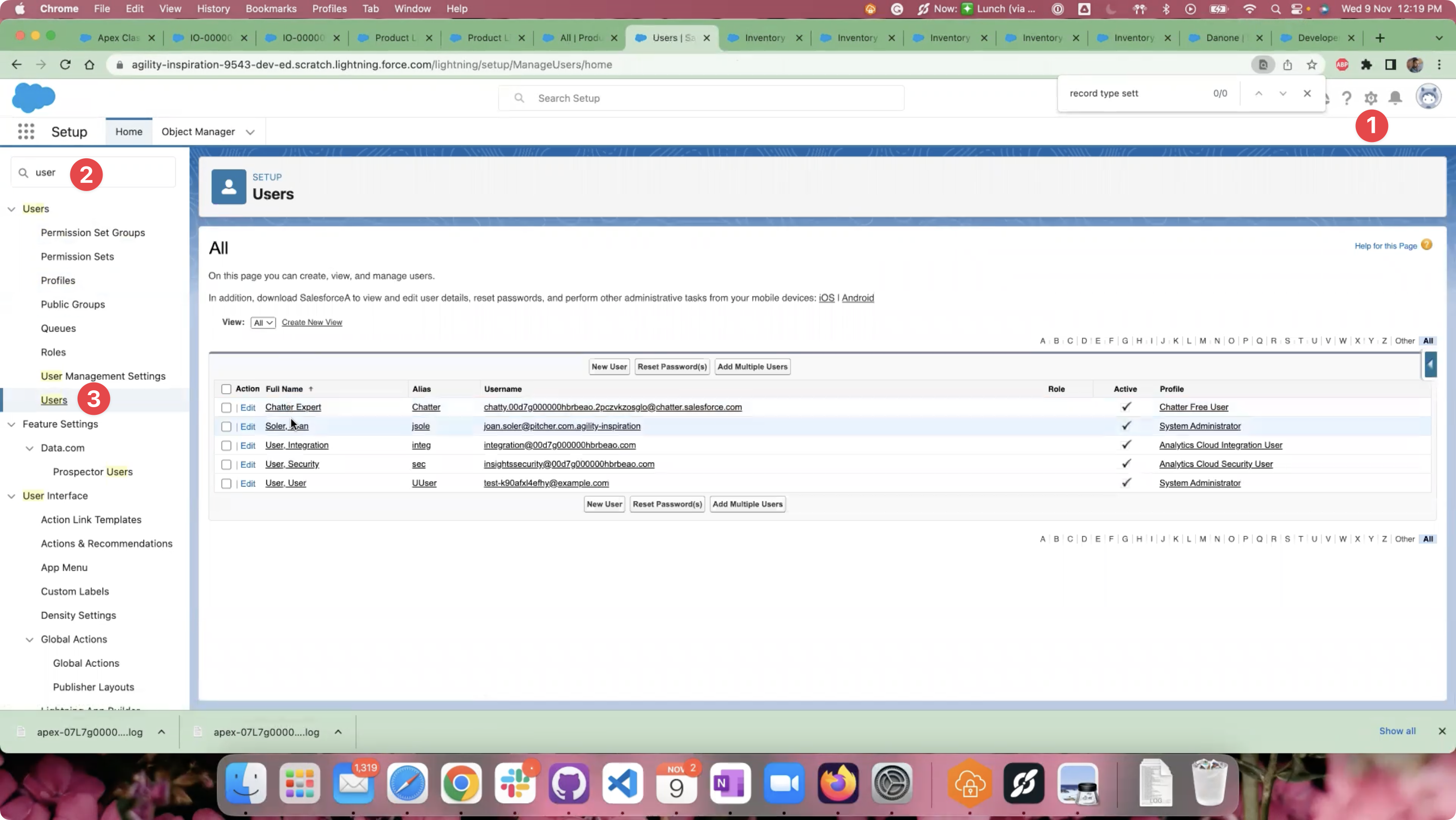 Go to the Users page by navigating to “Setup” > “Users” > “Users” or by searching for “Users” in the Quick Find search box from the Setup page.