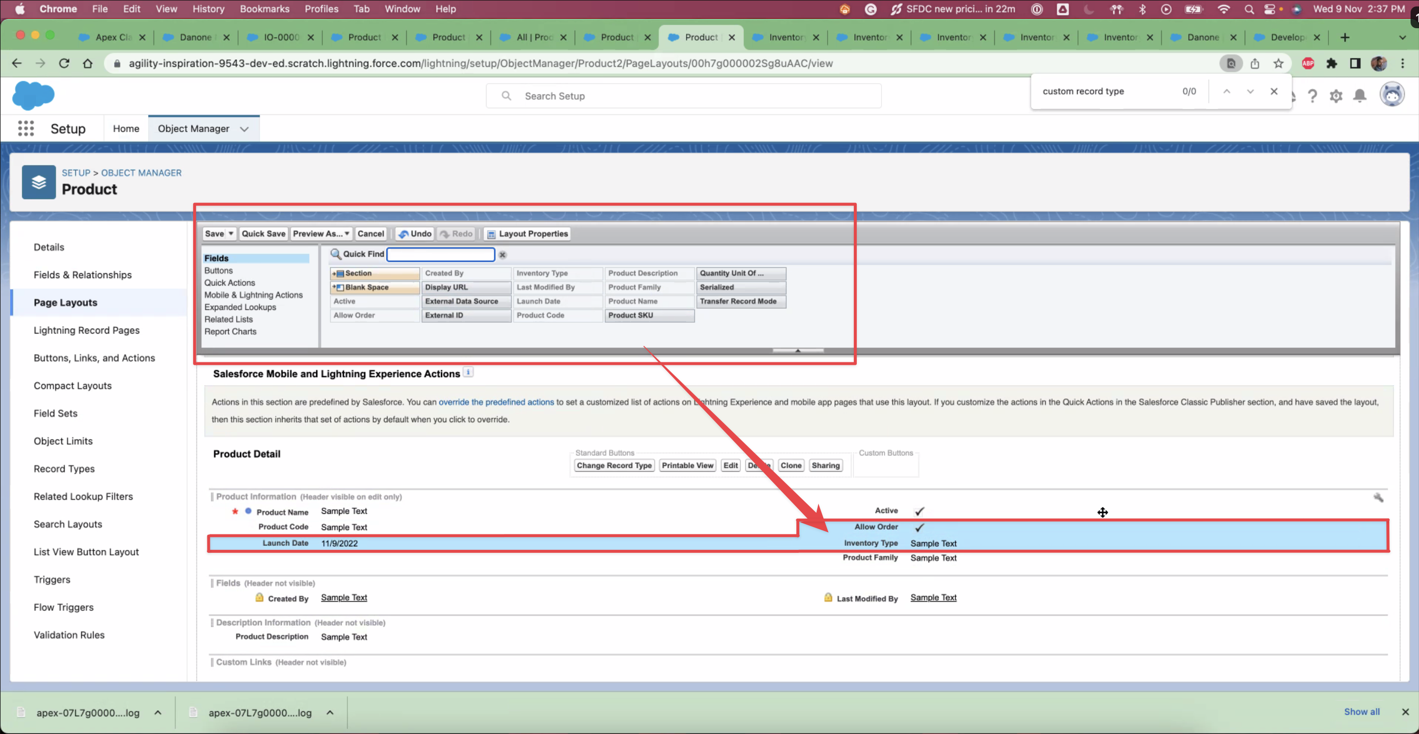 Assign the “Launch Date”, “Allow Order”, and “Inventory Type” fields to the Page Layout by dragging fields from the Fields section and dropping it in the Product Detail section.