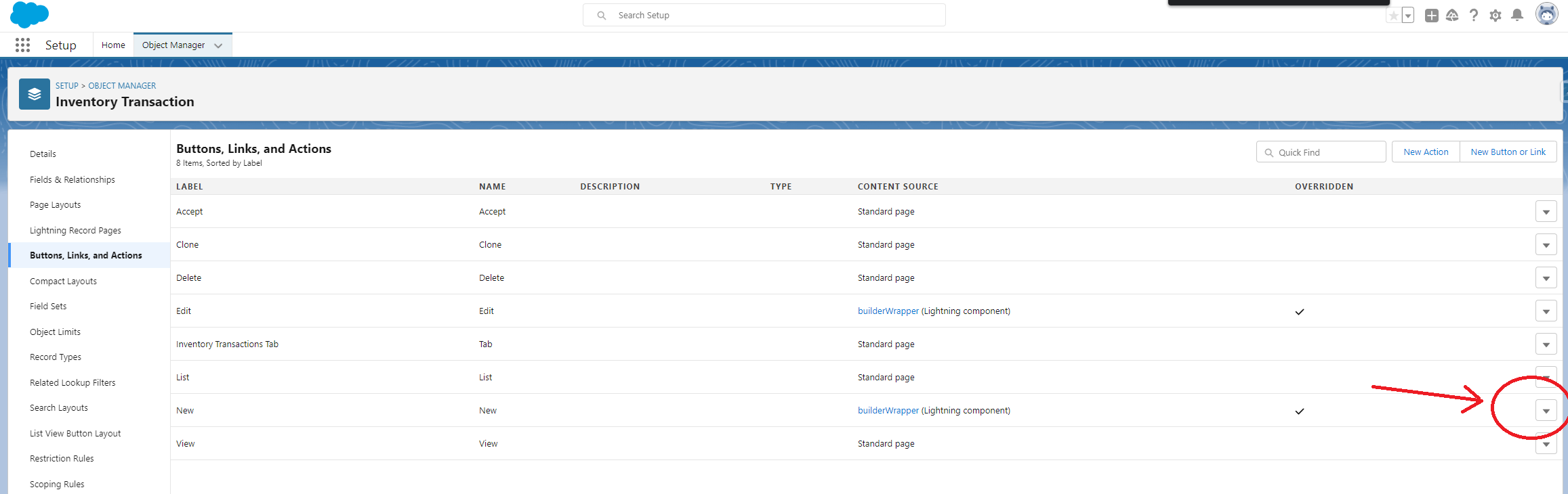 Go to the setup → object manager → Inventory Transaction → buttons links and actions
