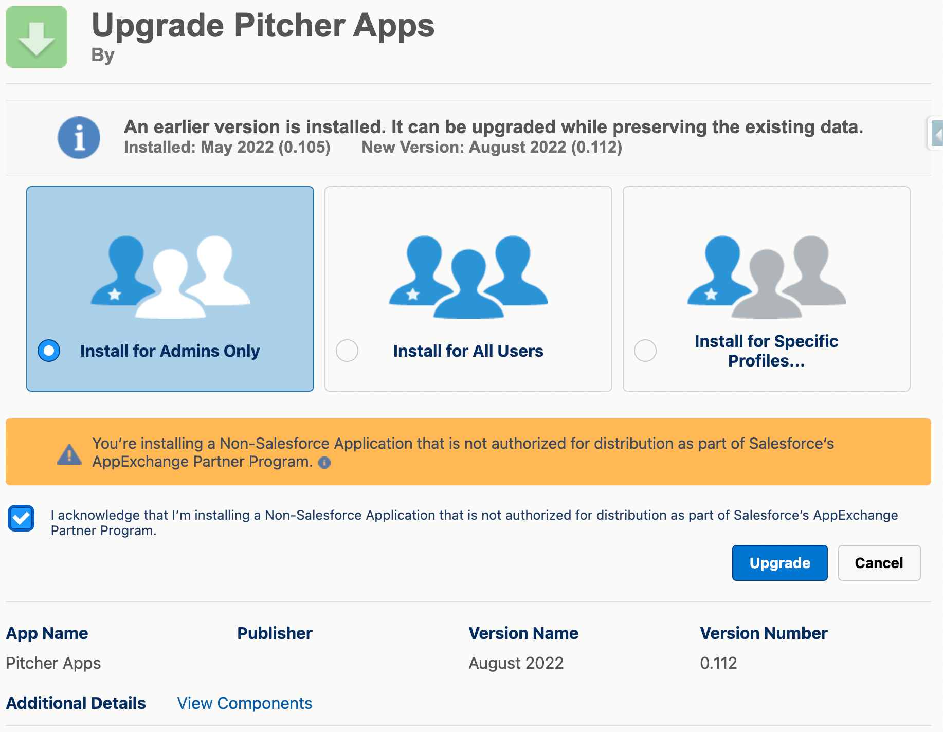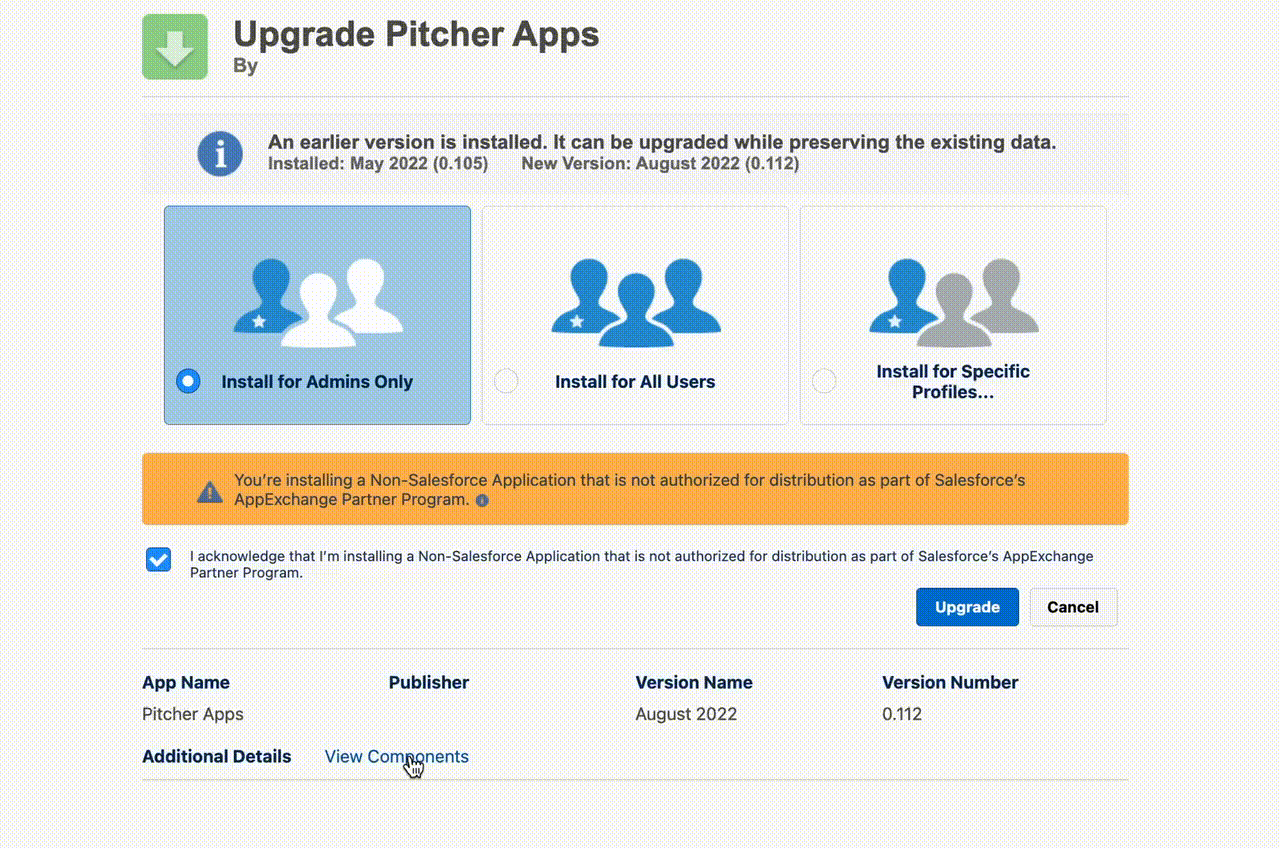 To verify the package components before installation/upgrade, click on the “View Components” link