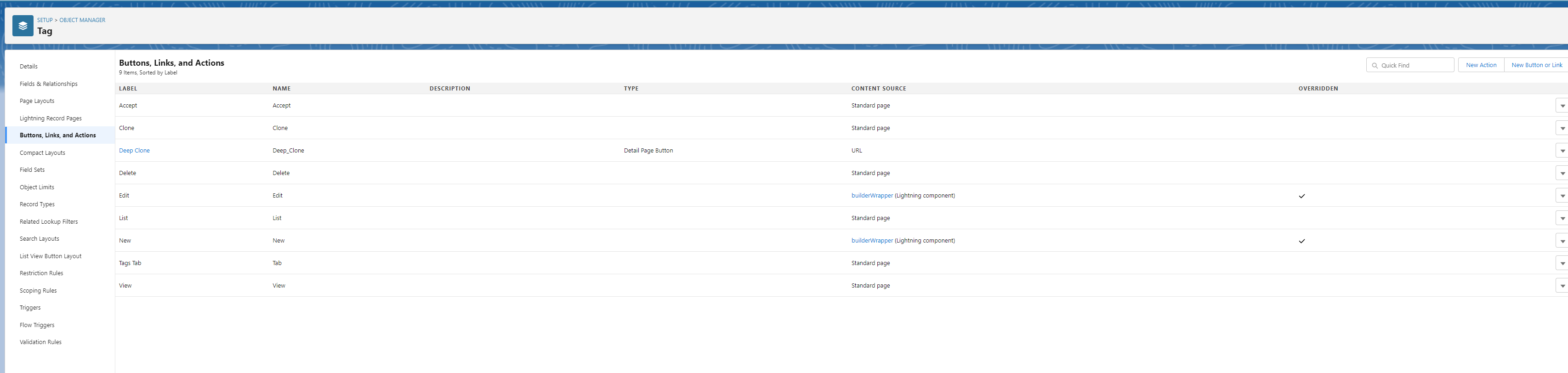 Go to Setup → Object Manager → Tag → Buttons, Links and Actions