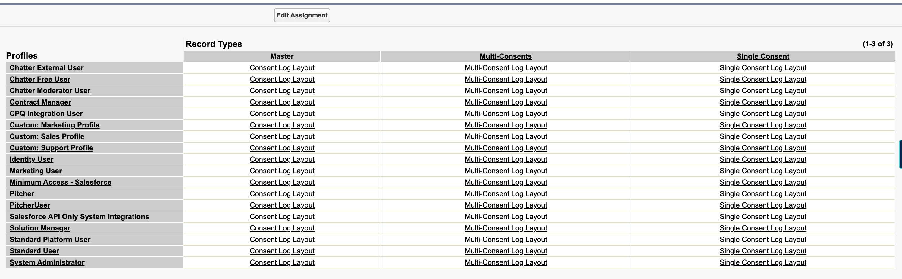 On the Profile page, scroll down to the “Record Type Settings” > “Custom Record Type Settings” section. Assign the following Record Types to these objects by clicking on the “Edit” link for the respective object.