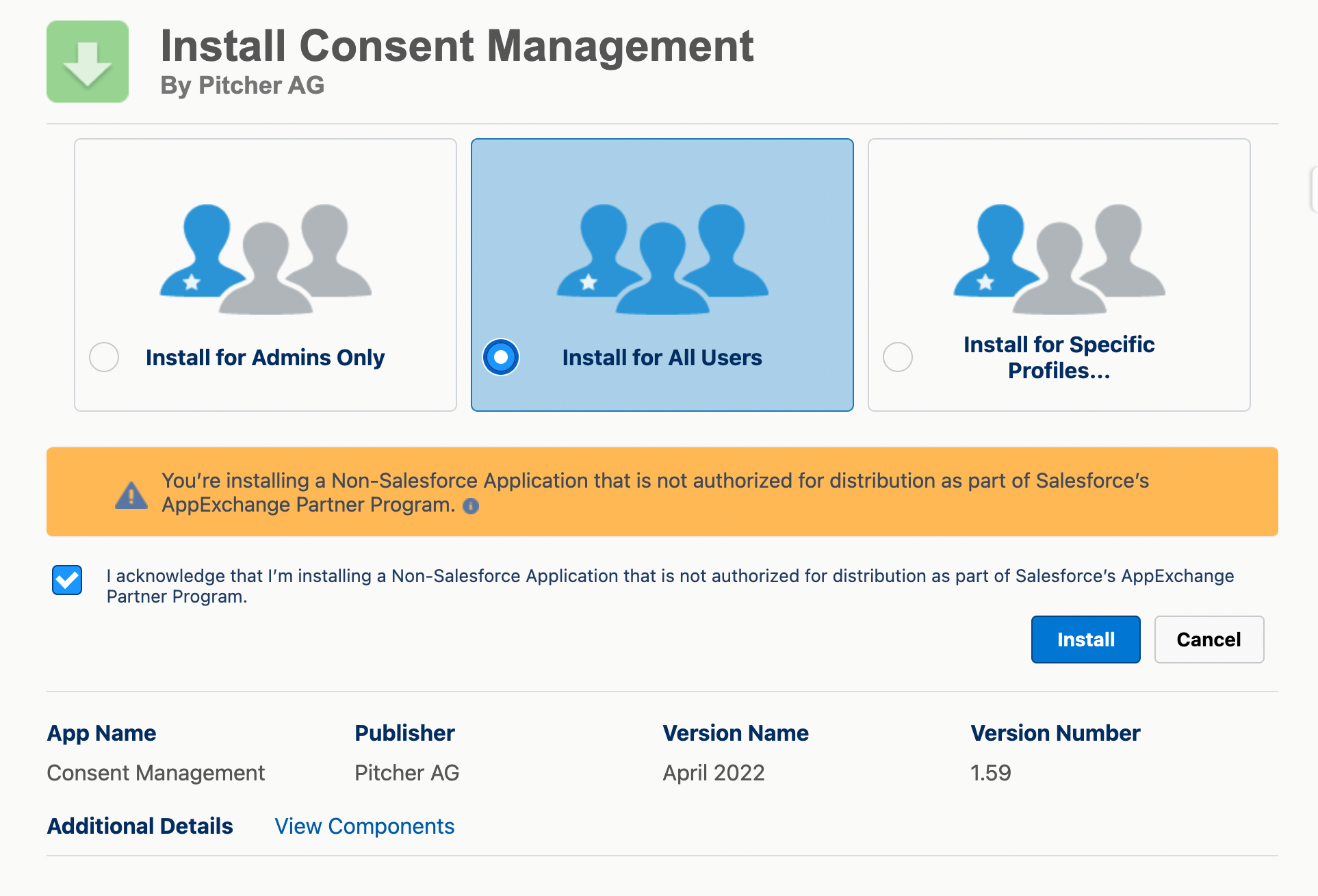 Check the acknowledgement and click Install to proceed.