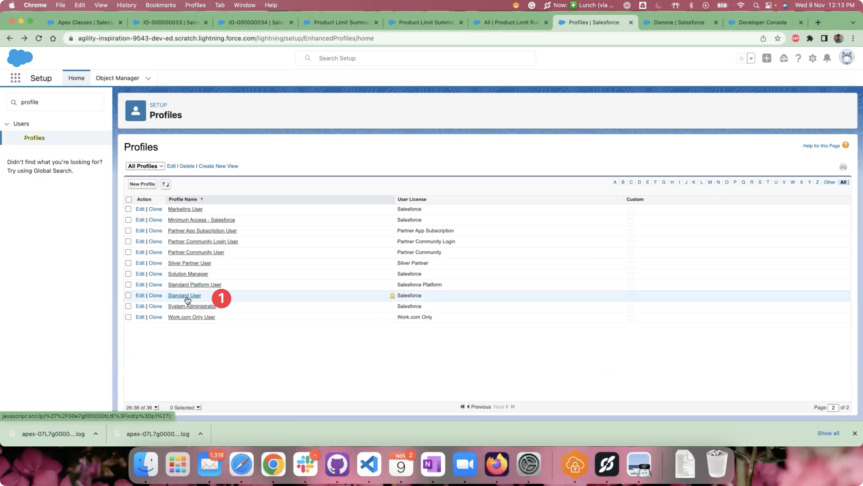 Go to the Profiles page by navigating to the “Setup” > “Users” > “Profiles” page or by searching for “Profiles” in the Quick Find search box from the Setup page.