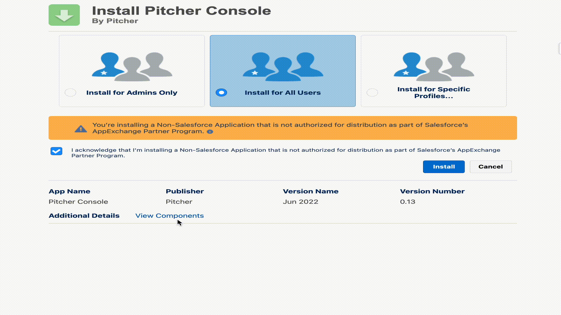 Select Install for Admins Only, Install for All Users, or Install for Specific Profiles, depending on the need.