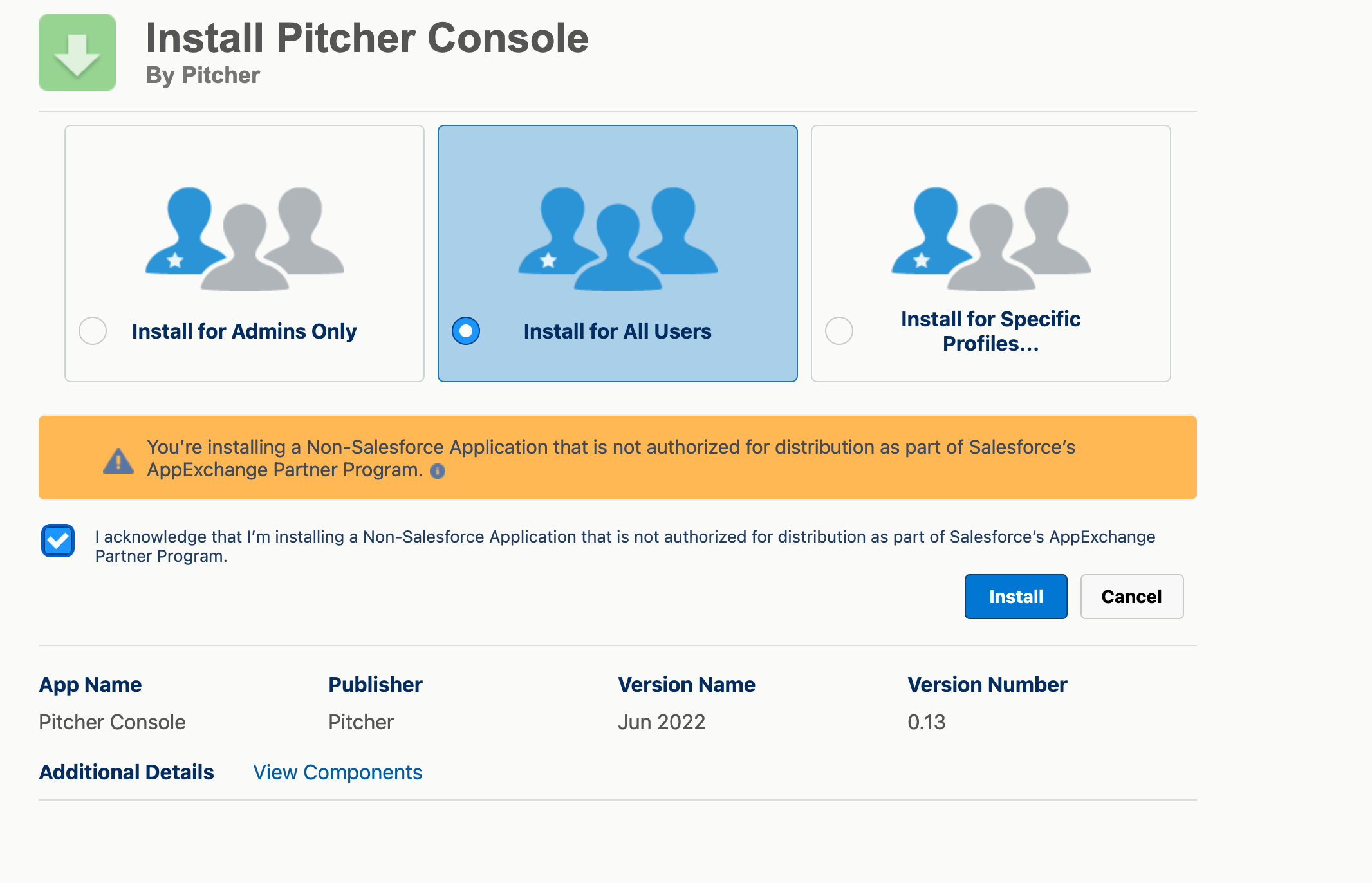 Check the acknowledgement and click Install to proceed.