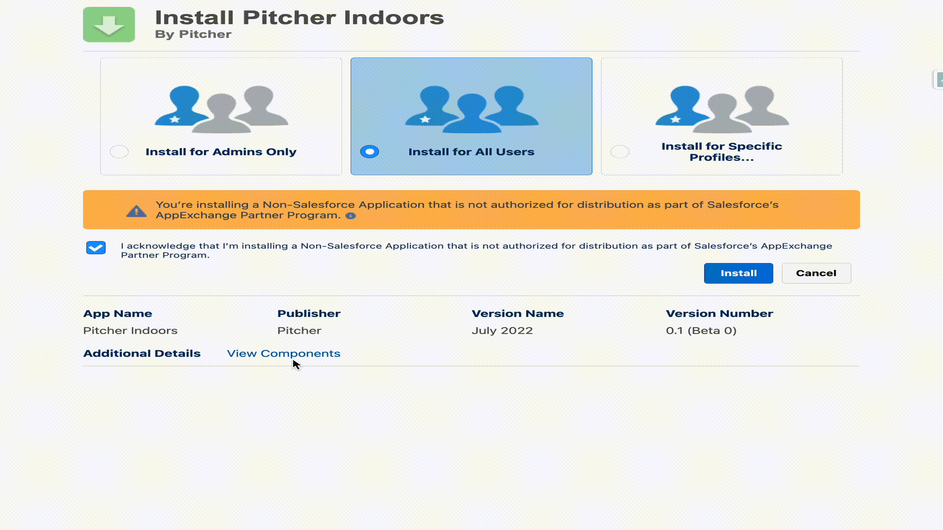 Select Install for Admins Only, Install for All Users, or Install for Specific Profiles, depending on the need.