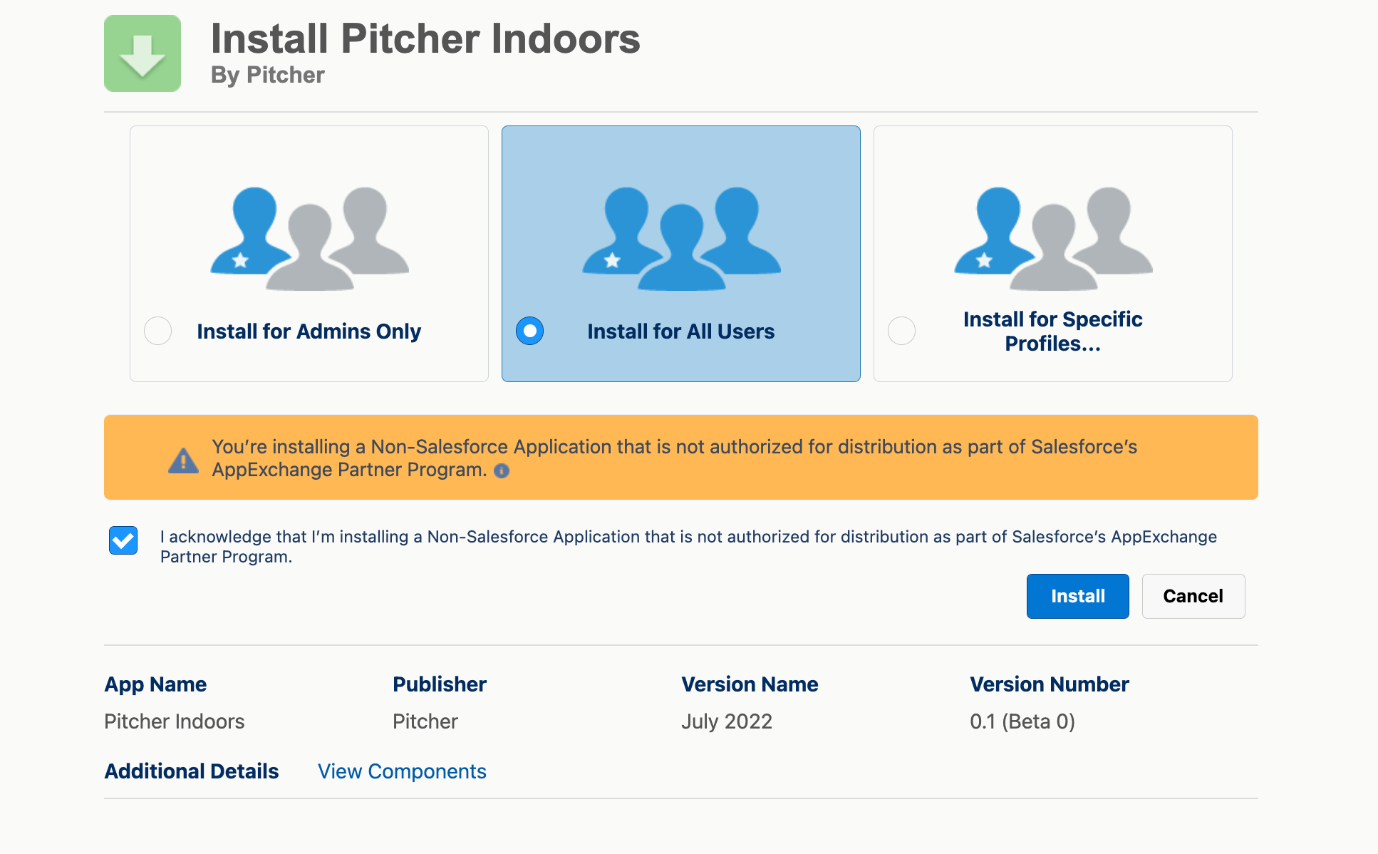 Check the acknowledgement and click Install to proceed.