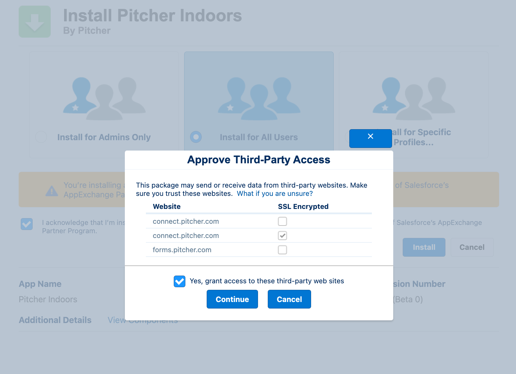 On the Approve Third-Party Access dialogue that appears, use the checkbox to grant access to required websites and click Continue to begin the installation.