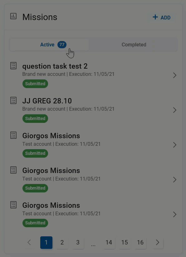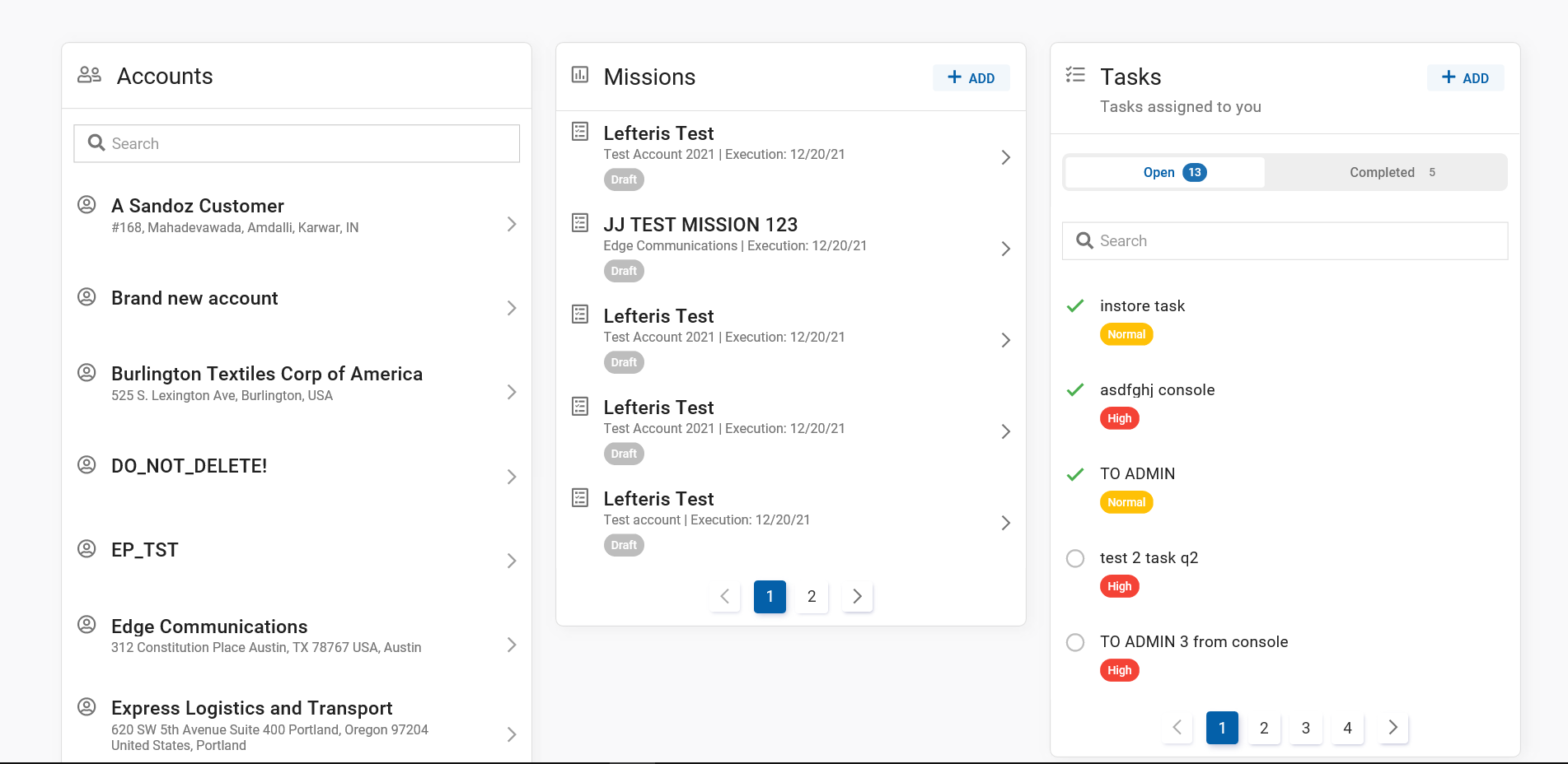 The Missions card is visible both in the territory console and the account console. The Missions card displays a list of all active missions assigned to different accounts within the territory. In contrast, the same Missions card shows Missions associated with the respective customer account in the account console.