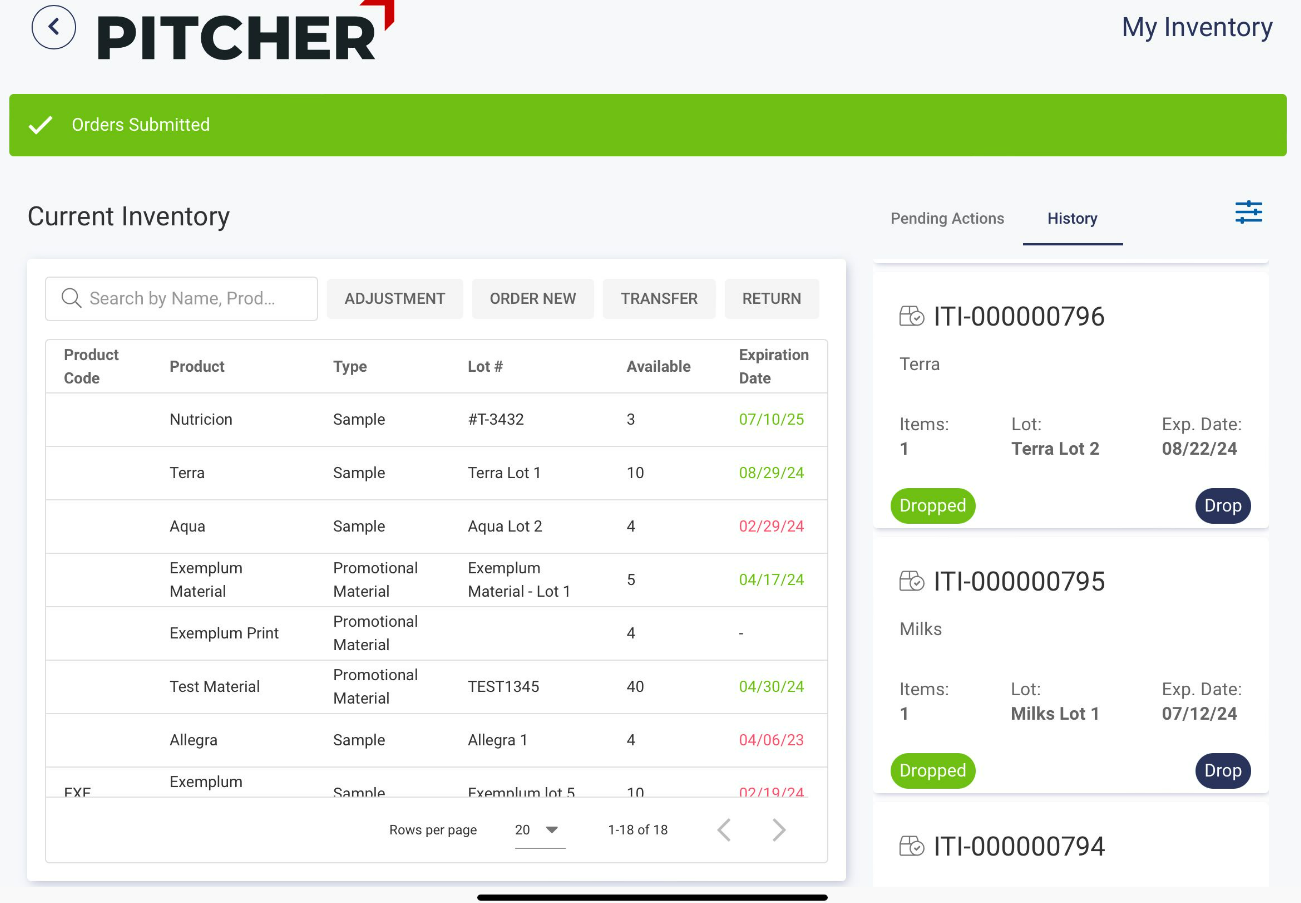 The new order requests are not instantly approved and require admin approval. You will see incoming inventory items in the “Pending Actions” tab.