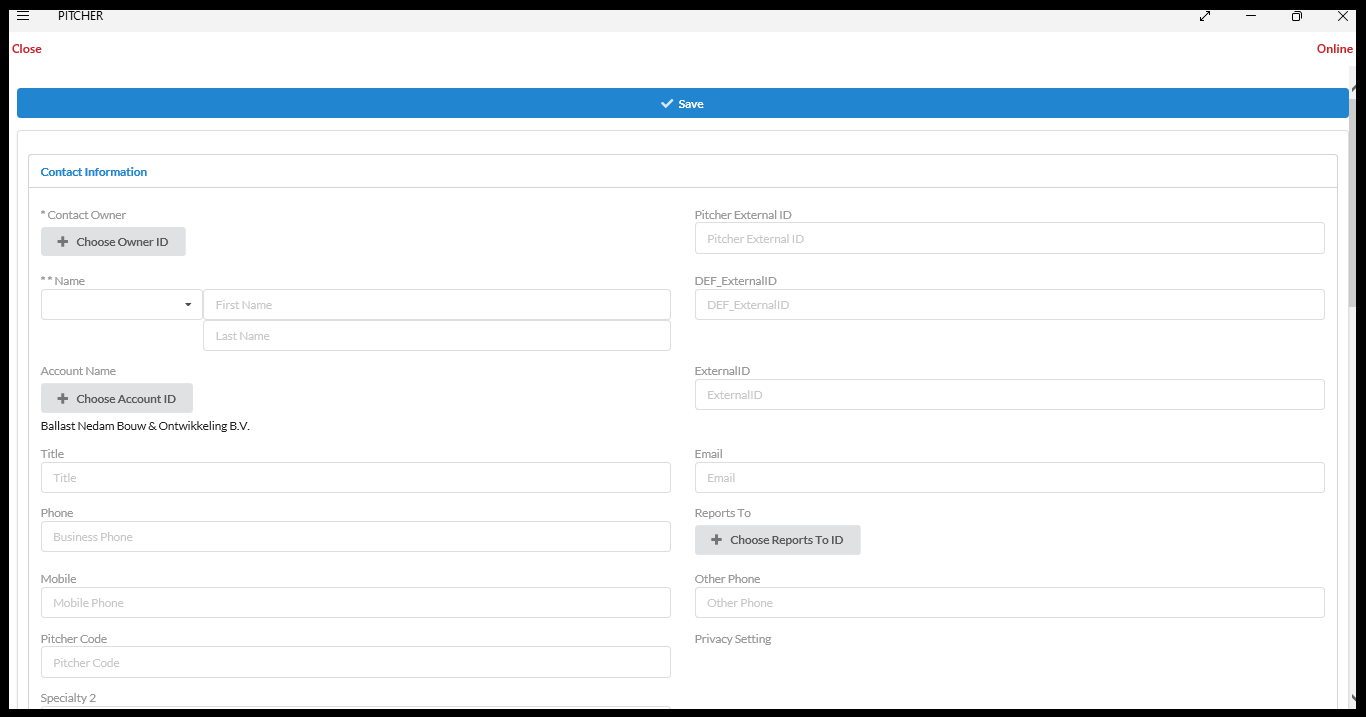 This page describes the contact creation form and steps to create a new contact on Impact for windows. The new account and contact can be created by using call planning feature. See detailed call for windows and quick call for windows. For creating new account and contact it is necessary to login to CRM. Refer this link