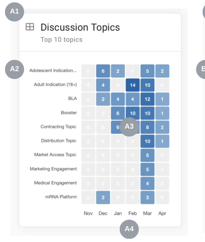 The topic widget shows the ten hottest topics of the past six months as a heat map. The topics widget helps sales representatives to address these topics with their customers during a meeting. You may see the discussion or insight topics based on the backend configuration.